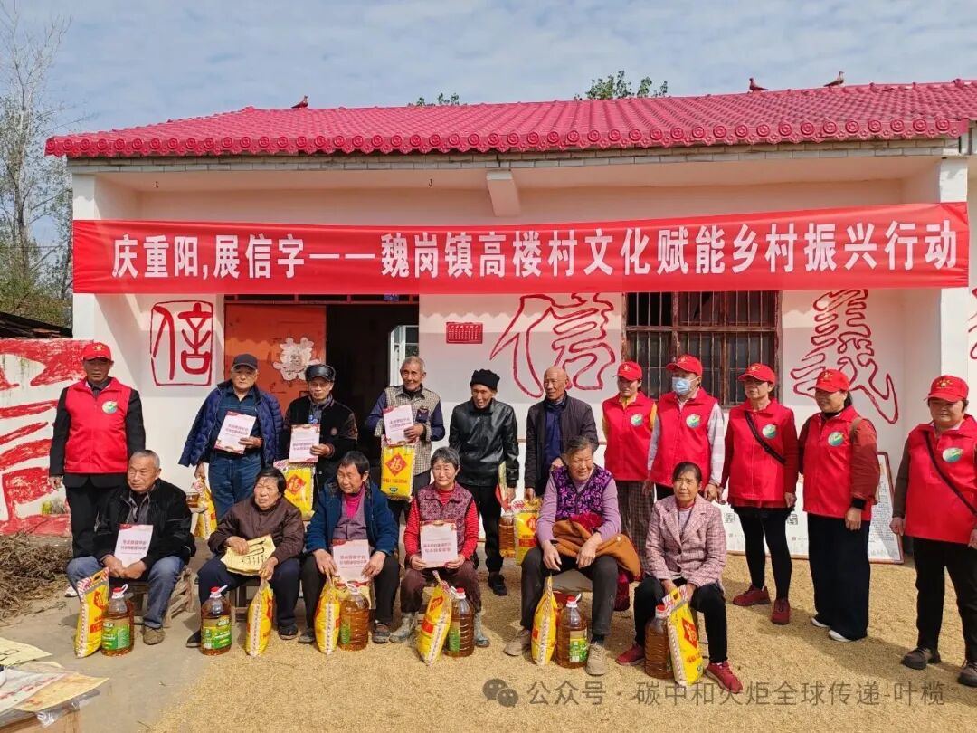 会客厅进行期间,来自潢川县城的爱心志愿者们在负责人余德海的带领下,慰问了信字村写“信”字的老人们,向每位老人送上重阳节的慰问品——一袋大米和一桶食用油,老人们连声道谢。杨继斌还举办了淮河印村“信、义”篆刻作品展,让“庆重阳,展信字——高楼村文化赋能乡村振兴行动”达到高潮。为了和本次活动主题相呼应,叶榄还组织了“绿色出行.碳中和火炬传递”,余德海带领胡国发、龚昌琼、叶先英、胡永芳、黄云、汪玉芬、王金群、丁昌友等爱心志愿者参与了火炬传递并表达了对绿色和平世界的祝福。