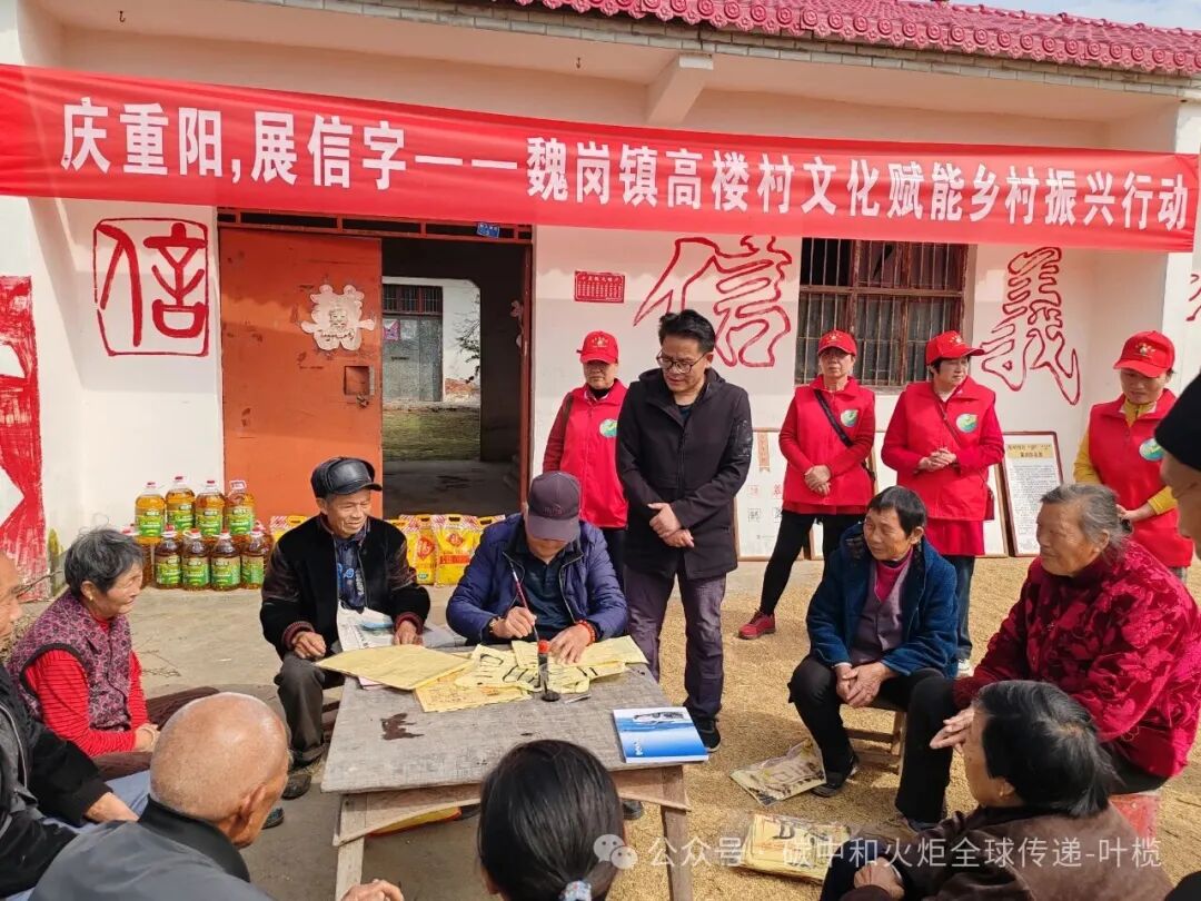 在信阳民间第400个“生态文明日”到来之际,2025年10月23日上午,一场文化赋能乡村振兴的展览活动在全国文明村、全国乡村治理示范村——河南省潢川县魏岗镇高楼村蔡大寨自然村(信字村)举办。信阳市第五届人大代表、魏岗镇副镇长、原高楼村支部书记宋保海,河南孝贤之星、淮河印村负责人杨继斌,爱心志愿者团队负责人余德海和爱心志愿者、信字村村民共20余人参加了“庆重阳,展信字——高楼村文化赋能乡村振兴行动”。