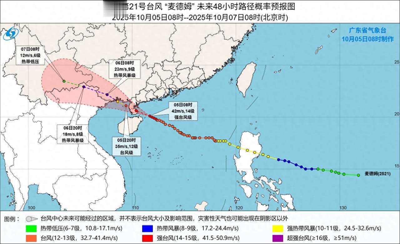 新快报讯 今年第21号台风“麦德姆”于5日05时加强为强台风级,08时其中心位于湛江市徐闻县东偏南方向约140公里的粤西海面上,中心附近最大风力14级(42米/秒),中心最低气压为955百帕,十级风圈半径150公里左右,十二级风圈半径80公里左右。预计,“麦德姆”将以25公里左右的时速向西北方向快速移动,5日中午前后登陆雷州半岛(强台风级,14级,42~45米/秒)。