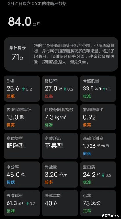 这是最近刚测的体重,体内脂肪非常多,体重严重超标。