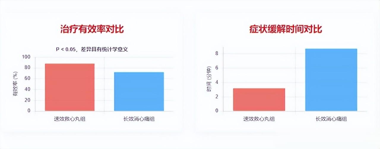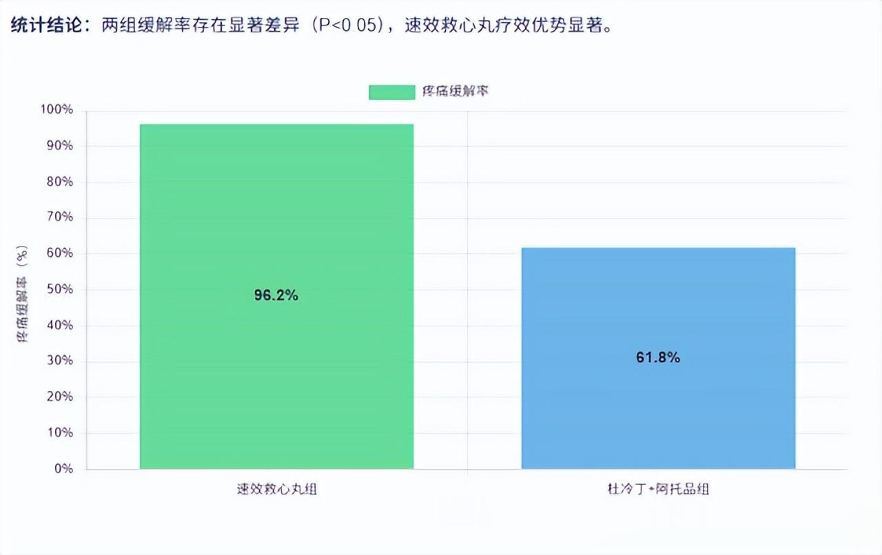 经过最多两次给药后,数据显示:速效救心丸治疗组的疼痛缓解率高达96.2%。而传统强力止痛针(杜冷丁+阿托品)对照组的缓解率为61.8%。经统计学分析,两者存在显著差异(P<0.05),这有力地证明了速效救心丸的疗效优势并非偶然。