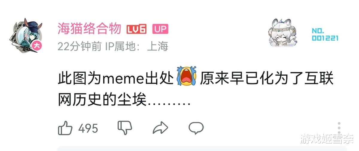 至此,已成艺术,海猫两年的努力和倔强最终还是完败了,而且,在海猫执着于让所有人知道墨镜梗的同时,海猫自己也变成了梗,世界名画《海猫,墨镜,终末地》今晚海猫要回家躲被窝掉小珍珠了。
