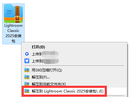 安装步骤:1、得到压缩包之后,鼠标右键解压,点击【解压到Lightroom Classic 2025安装包】。