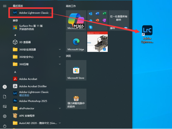 7、点击电脑桌面左下角开始按钮,找到刚刚安装的【Adobe Lightroom Classic】软件,鼠标左键按住不放,拖拽到电脑桌面。