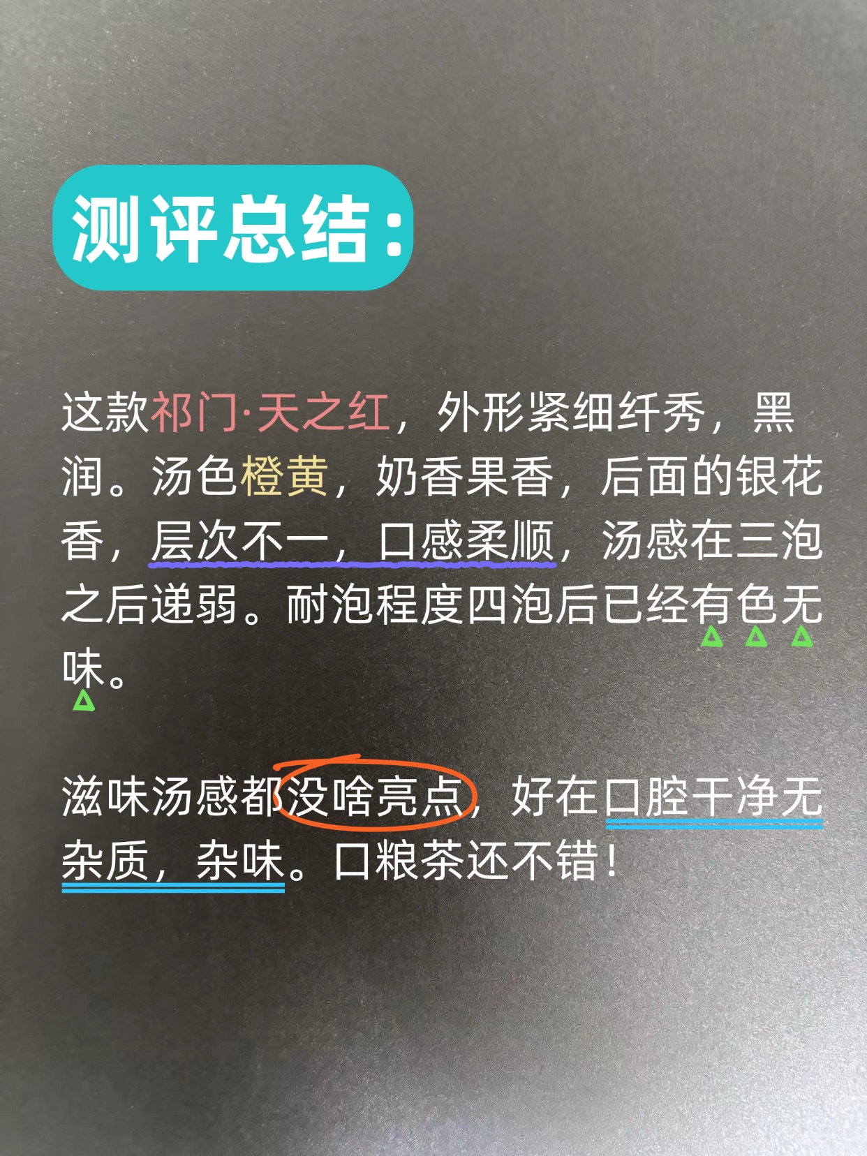 这款祁门·天之红,外形紧细纤秀,黑润。汤色橙黄,奶香果香,后面的银花香,层次不一,口感柔顺,汤感在三泡之后递弱。耐泡程度四泡后已经有色无味。滋味汤感都没啥亮点,好在口腔干净无杂质,杂味。口粮茶还不错!