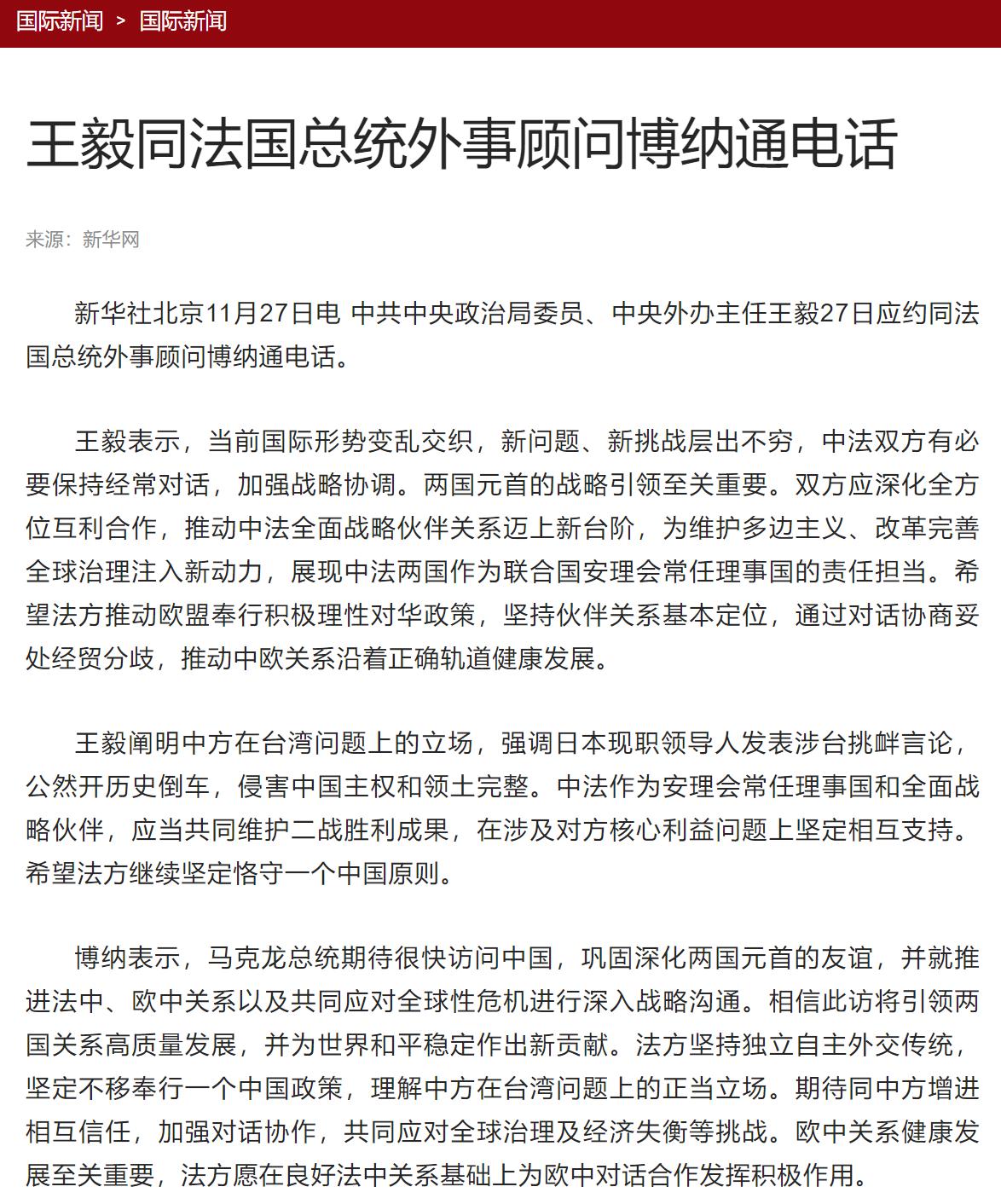 据环球网报道,日前王毅外长同法国总统外事顾问通电话,中方开门见山的提到了高市早苗发表的谬论,将其定性为对中国的挑衅和对中国主权的侵犯,强调中法同为安理会常任理事国,应当发挥表率作用,共同维护二战成果,希望法方恪守“一中”。