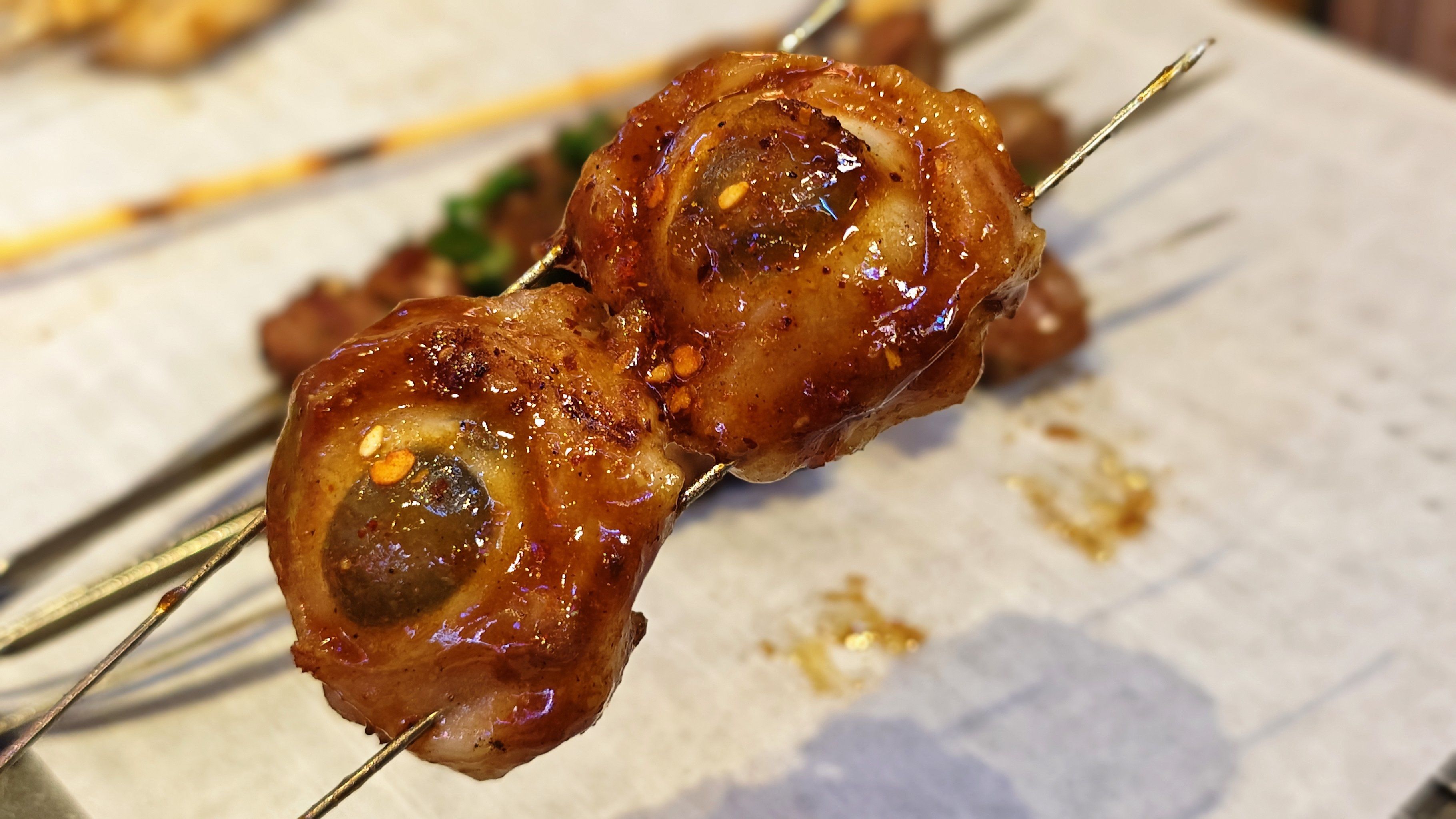 一整颗完整的猪眼球,连着周围的肌肉组织,直接上火烤。烤制过程需要极大的耐心,既要烤透,又不能烤爆。吃这道美食需要技巧:不能心急,要等稍微凉一点,然后整颗放入口中,轻轻一咬——眼房里的汁水会在口腔中瞬间“爆浆”,那种浓郁的、混合着油脂香味的液体涌出,带来无与伦比的满足感。很多人曾对它望而却步,但一旦试过,就对那种Q弹软脆的口感念念不忘。