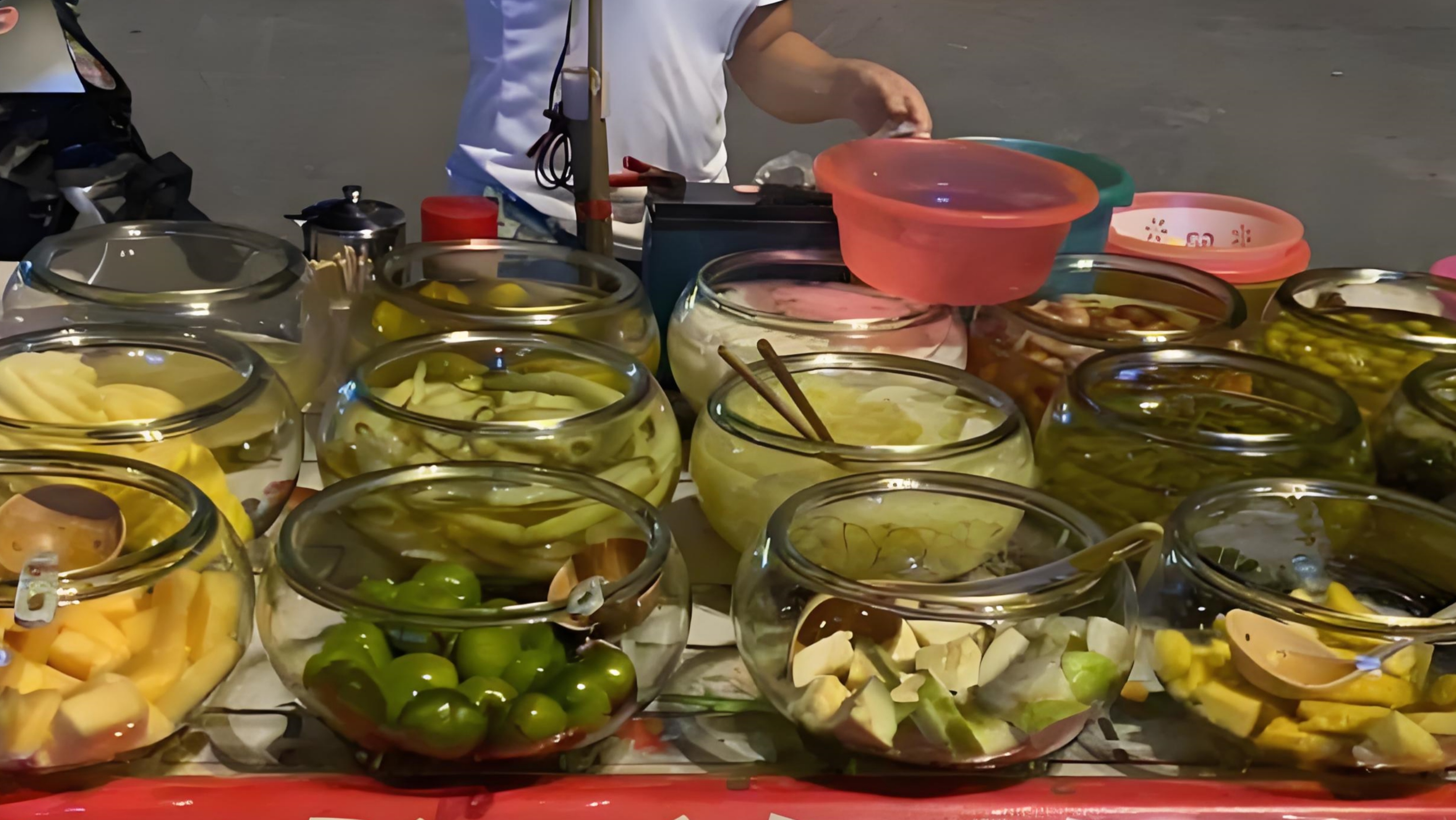 所谓“酸嘢”,指的就是酸的东西。广西人似乎有一种魔力,能把萝卜、黄瓜、芒果、番石榴甚至菠萝,用酸醋、辣椒、白糖腌制起来。当你咬下第一口,那种“嘎巴脆”的口感瞬间在齿间炸开,先是直冲脑门的酸,紧接着是淡淡的回甘,最后是辣椒粉带来的燥热。酸甜爽辣交织在一起,生津开胃,让人欲罢不能。