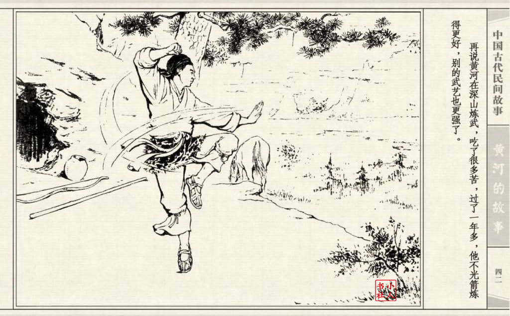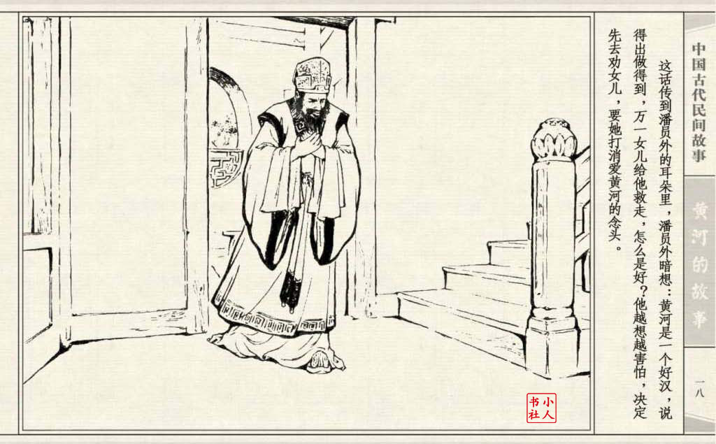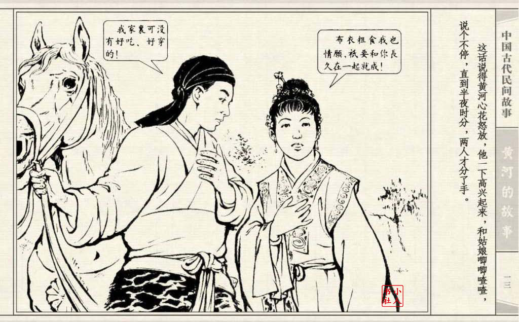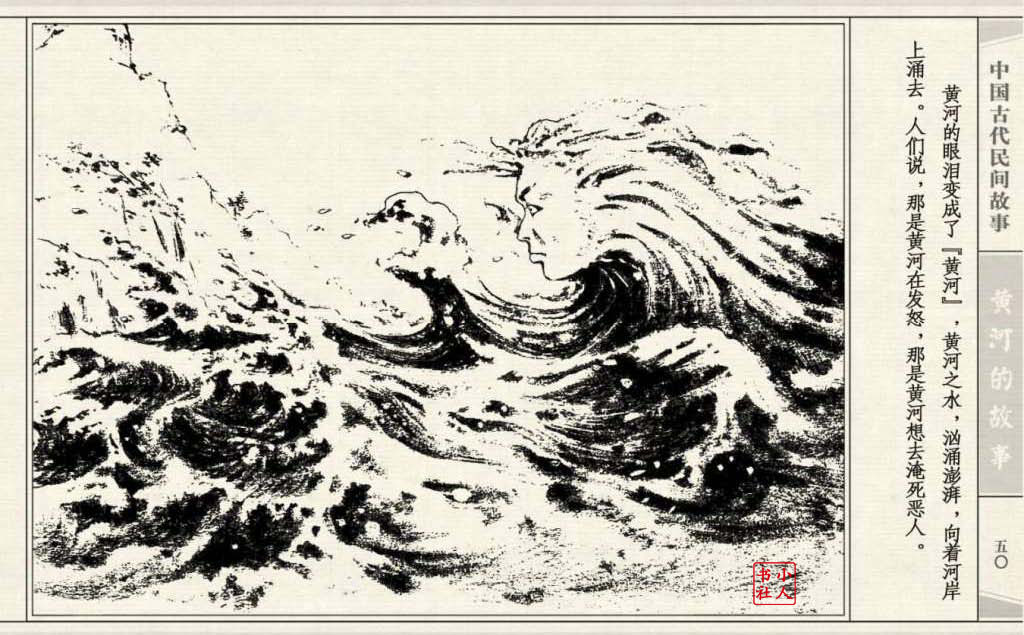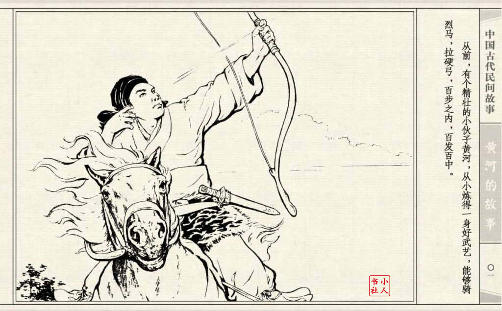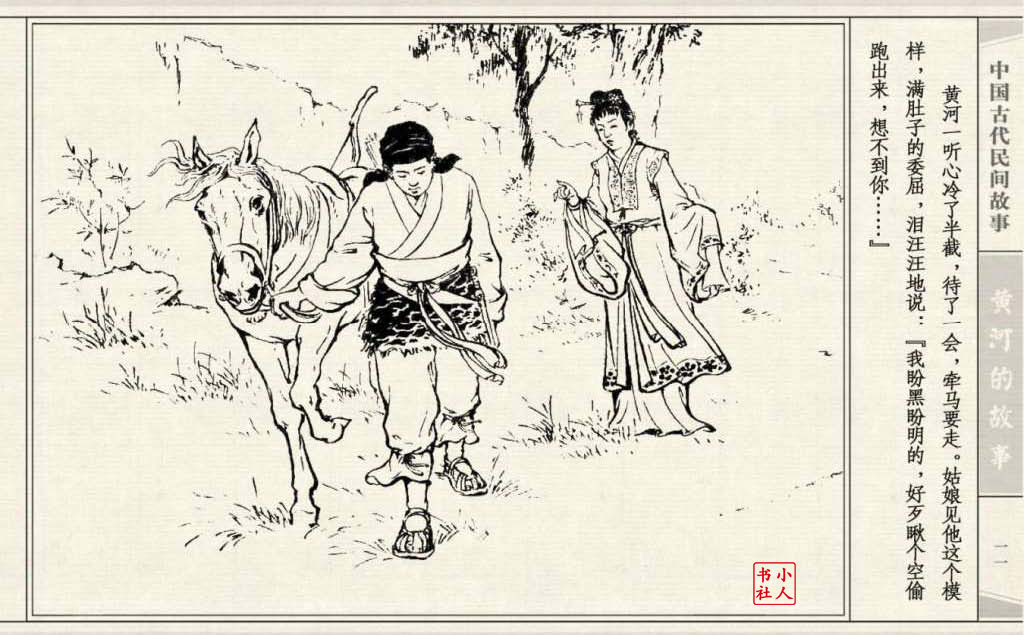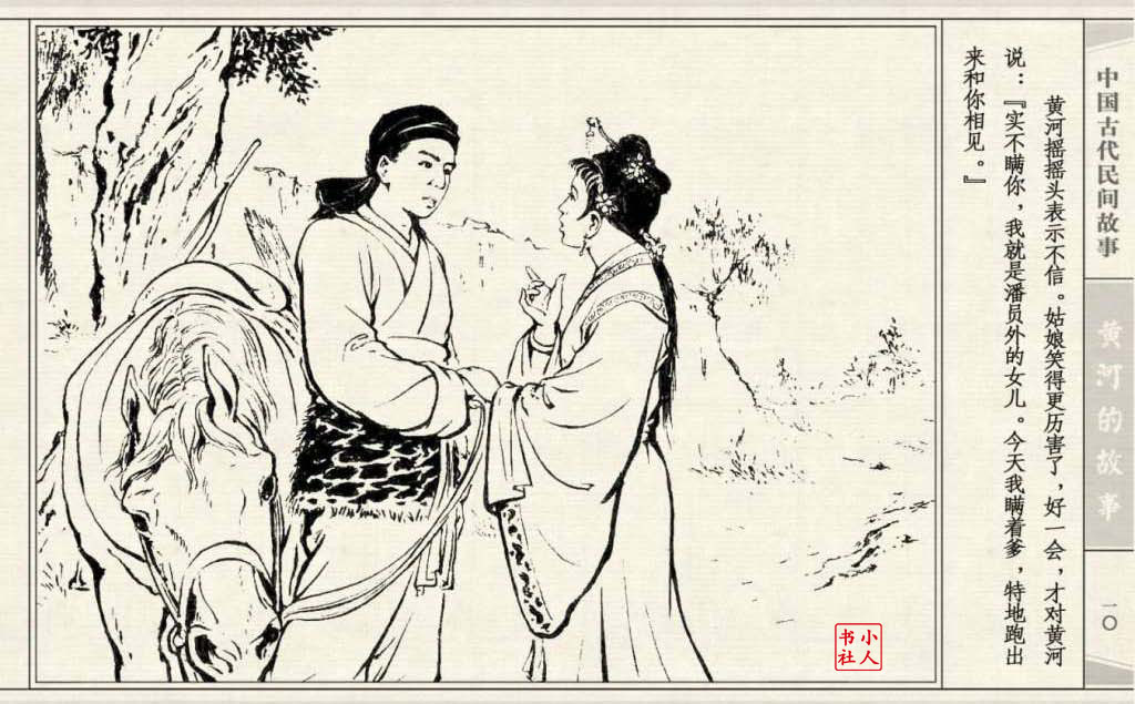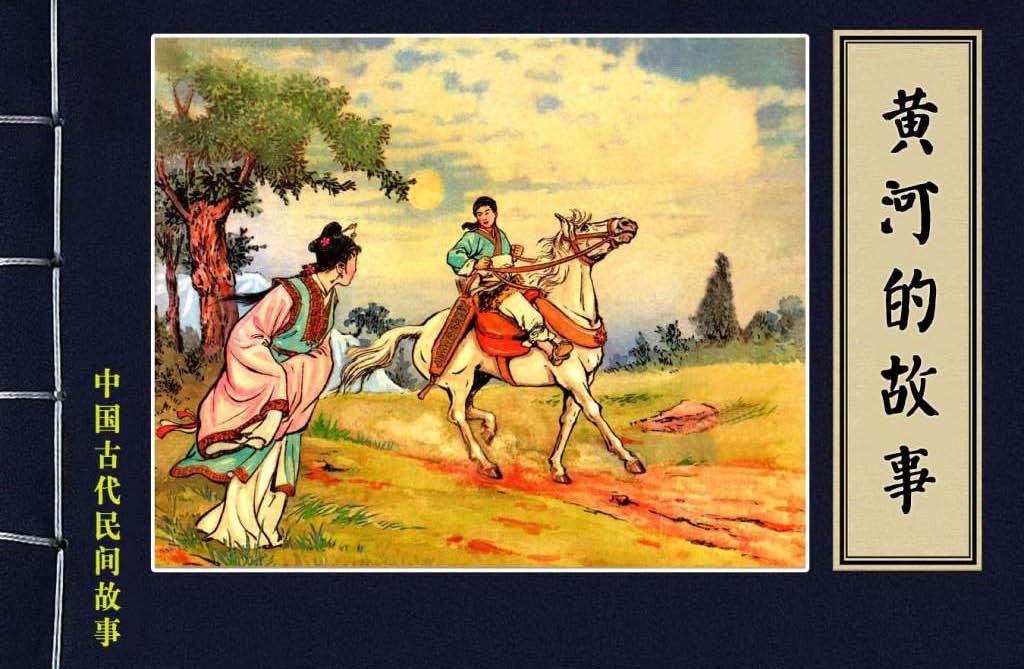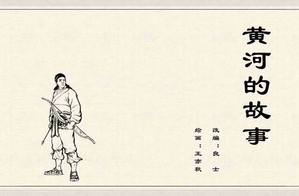 《黄河的故事》连环画是由良士改编,王亦秋绘画。故事讲述小伙子黄河与一位富家的姑娘相恋,黄河的生活由此而改变,爱得充满幻想和期待。姑娘的父亲潘员外为阻止他们相爱,以“比箭招亲”难为黄河。轻巧的一道题目,就让黄河败北,让黄河百步穿杨的箭术落空。黄河在失落之际远避深山苦炼武功,以图东山再起,挽回悲剧的命运,可以和姑娘终得圆满。然而,就在黄河艺成下山之时,姑娘早已因为不屈于压迫而香消玉陨。爱情终于在世俗的压迫下消失,愤怒也在世俗的压迫下膨胀,于是,黄河的眼泪汹涌而出,演变成“浊浪滔天”的“黄河”。