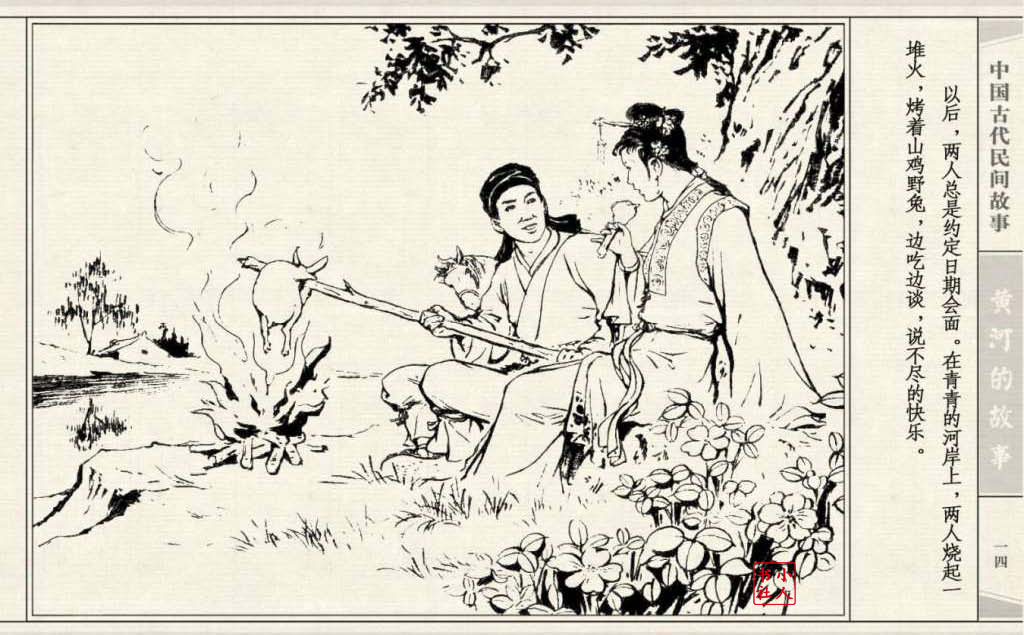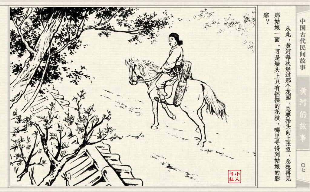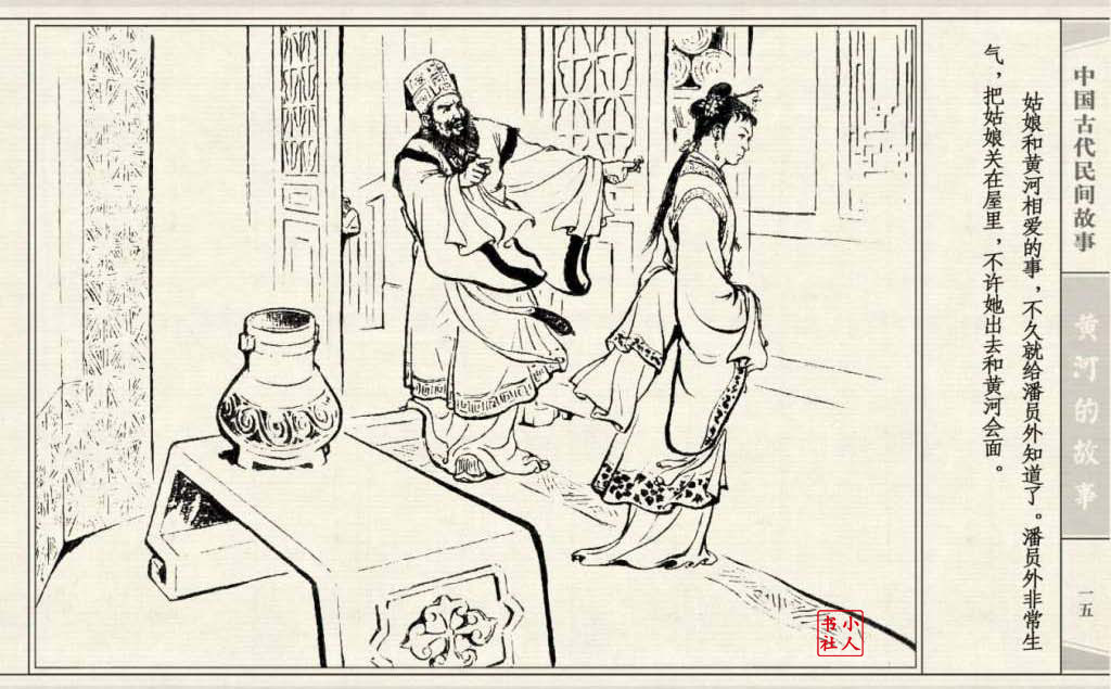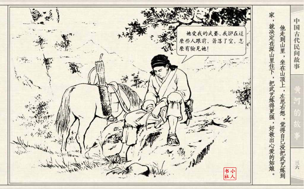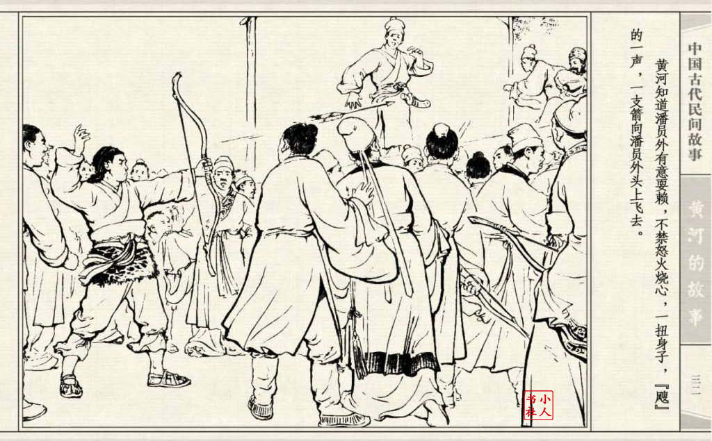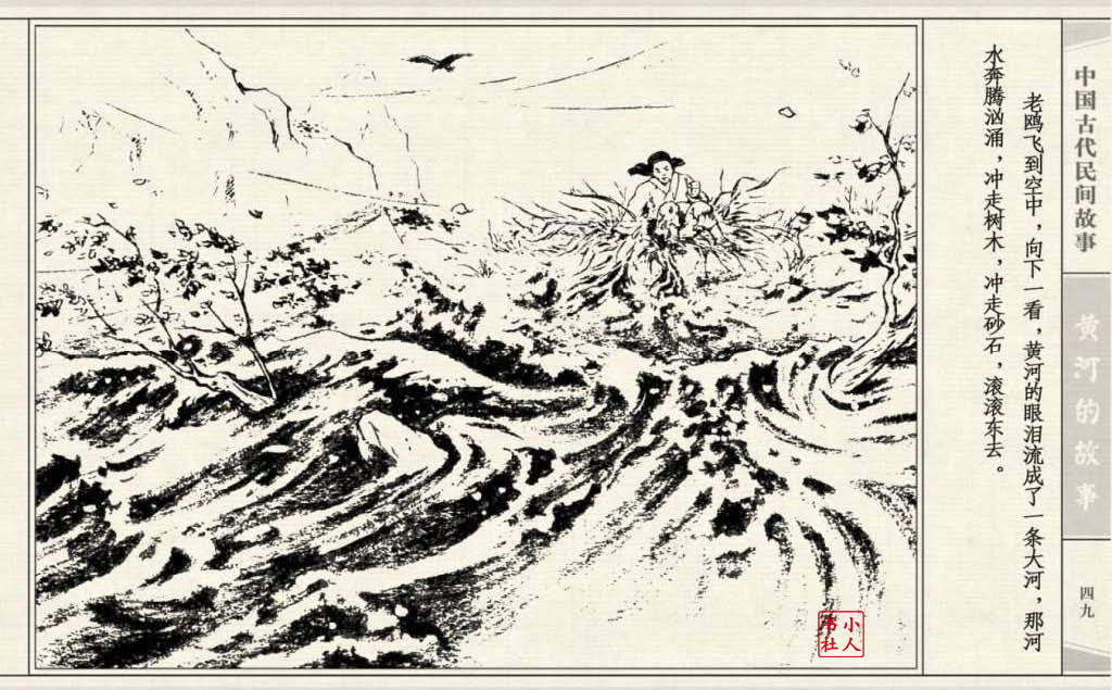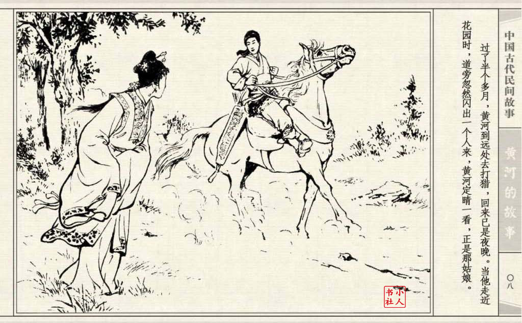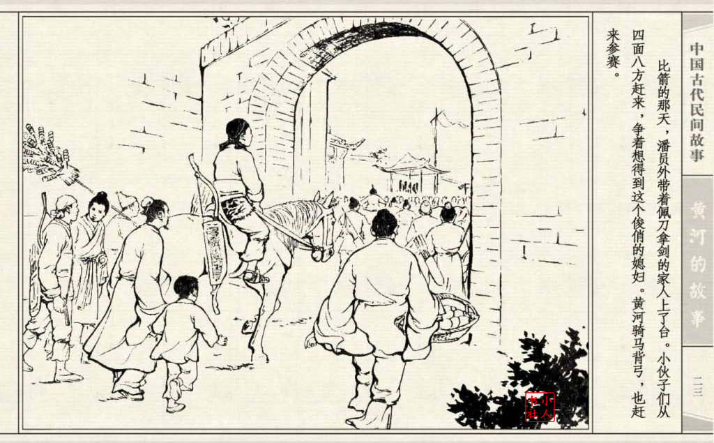 《黄河的故事》连环画是由良士改编,王亦秋绘画。故事讲述小伙子黄河与一位富家的姑娘相恋,黄河的生活由此而改变,爱得充满幻想和期待。姑娘的父亲潘员外为阻止他们相爱,以“比箭招亲”难为黄河。轻巧的一道题目,就让黄河败北,让黄河百步穿杨的箭术落空。黄河在失落之际远避深山苦炼武功,以图东山再起,挽回悲剧的命运,可以和姑娘终得圆满。然而,就在黄河艺成下山之时,姑娘早已因为不屈于压迫而香消玉陨。爱情终于在世俗的压迫下消失,愤怒也在世俗的压迫下膨胀,于是,黄河的眼泪汹涌而出,演变成“浊浪滔天”的“黄河”。