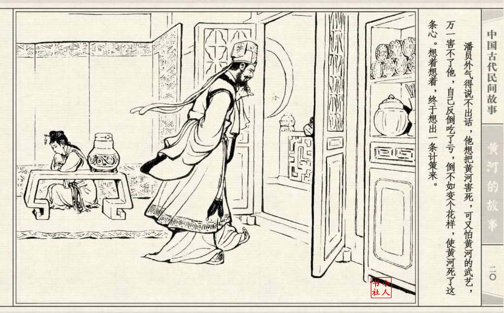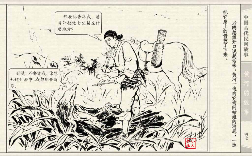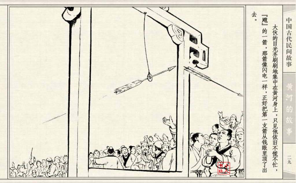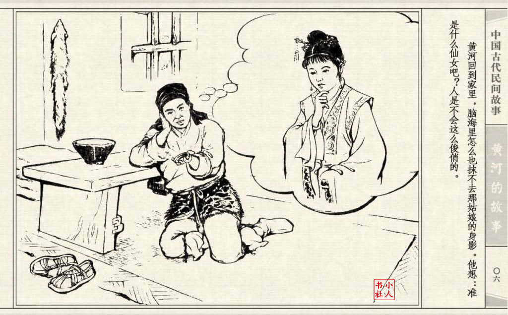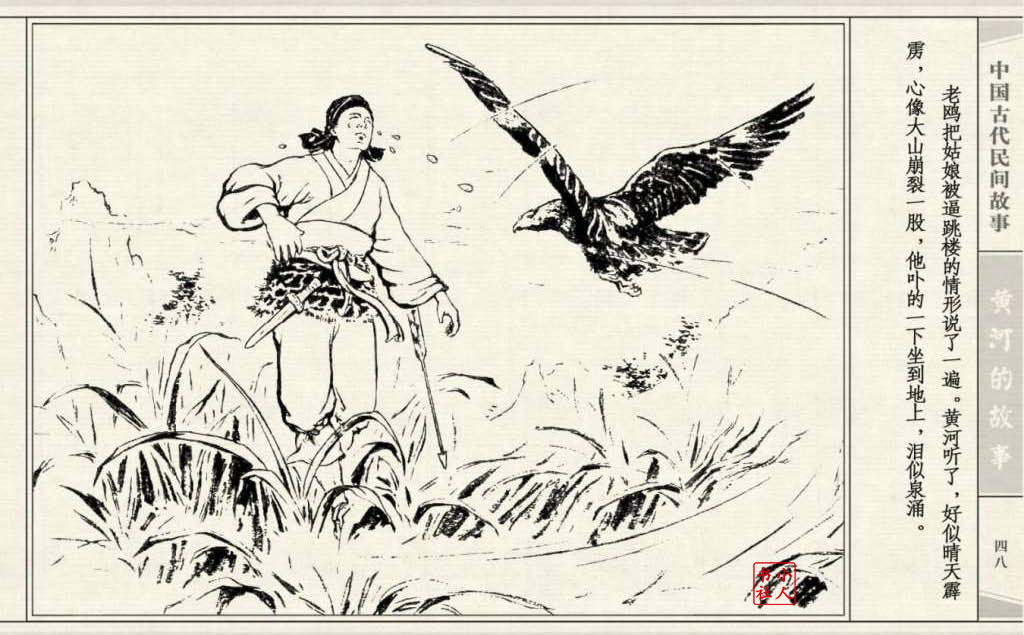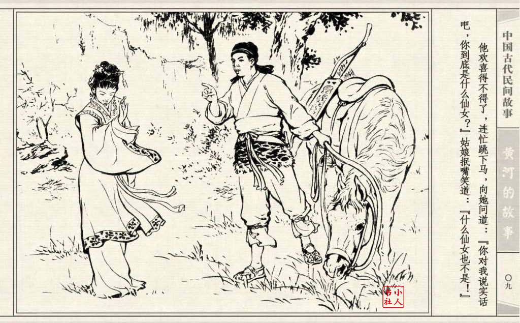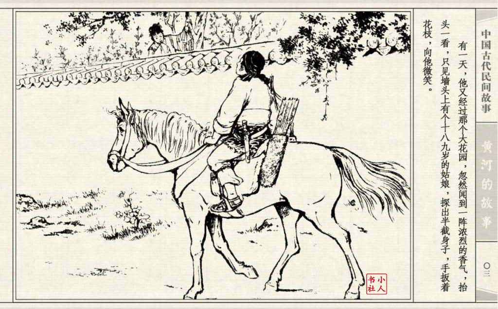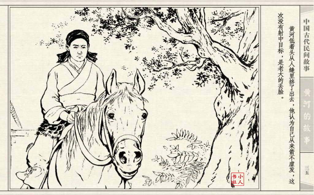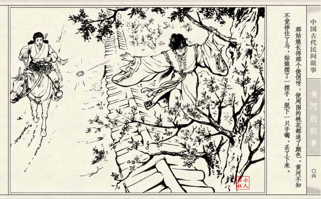 《黄河的故事》连环画是由良士改编,王亦秋绘画。故事讲述小伙子黄河与一位富家的姑娘相恋,黄河的生活由此而改变,爱得充满幻想和期待。姑娘的父亲潘员外为阻止他们相爱,以“比箭招亲”难为黄河。轻巧的一道题目,就让黄河败北,让黄河百步穿杨的箭术落空。黄河在失落之际远避深山苦炼武功,以图东山再起,挽回悲剧的命运,可以和姑娘终得圆满。然而,就在黄河艺成下山之时,姑娘早已因为不屈于压迫而香消玉陨。爱情终于在世俗的压迫下消失,愤怒也在世俗的压迫下膨胀,于是,黄河的眼泪汹涌而出,演变成“浊浪滔天”的“黄河”。