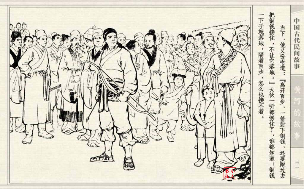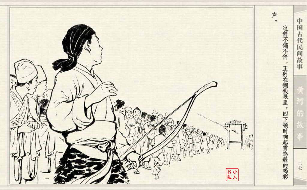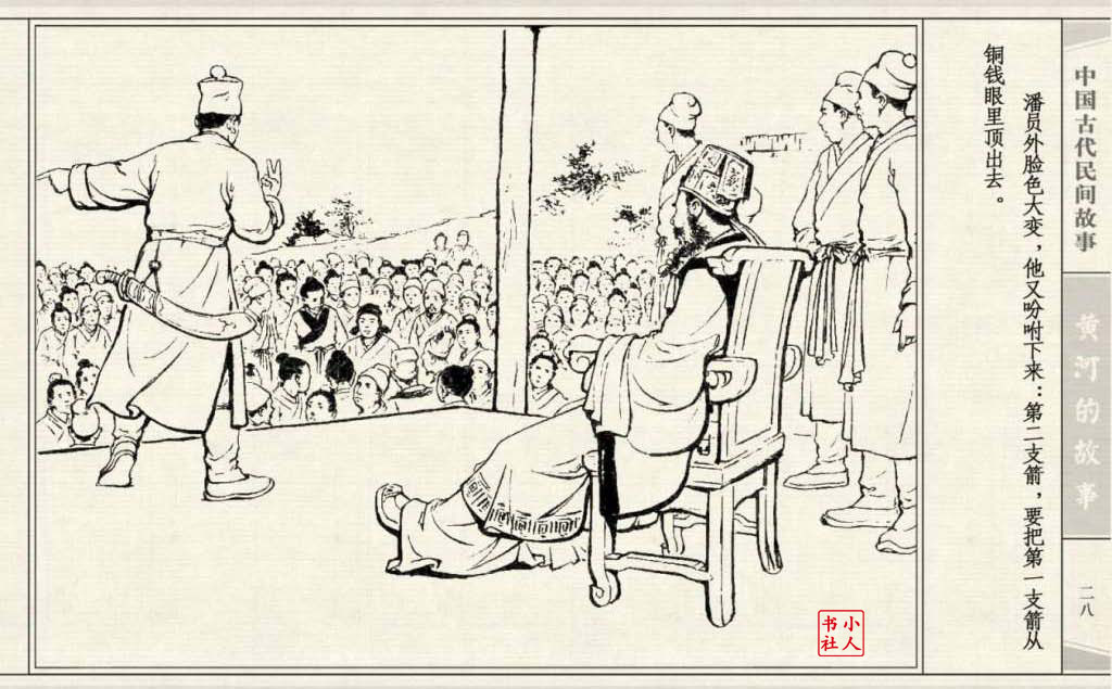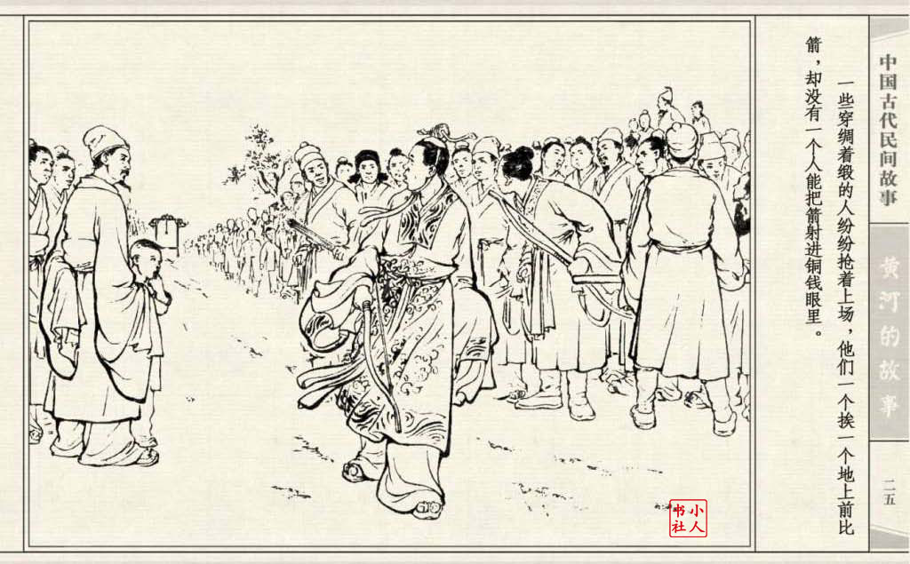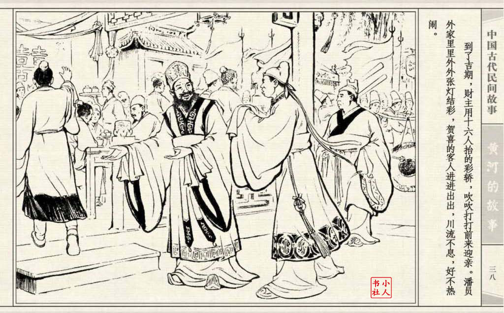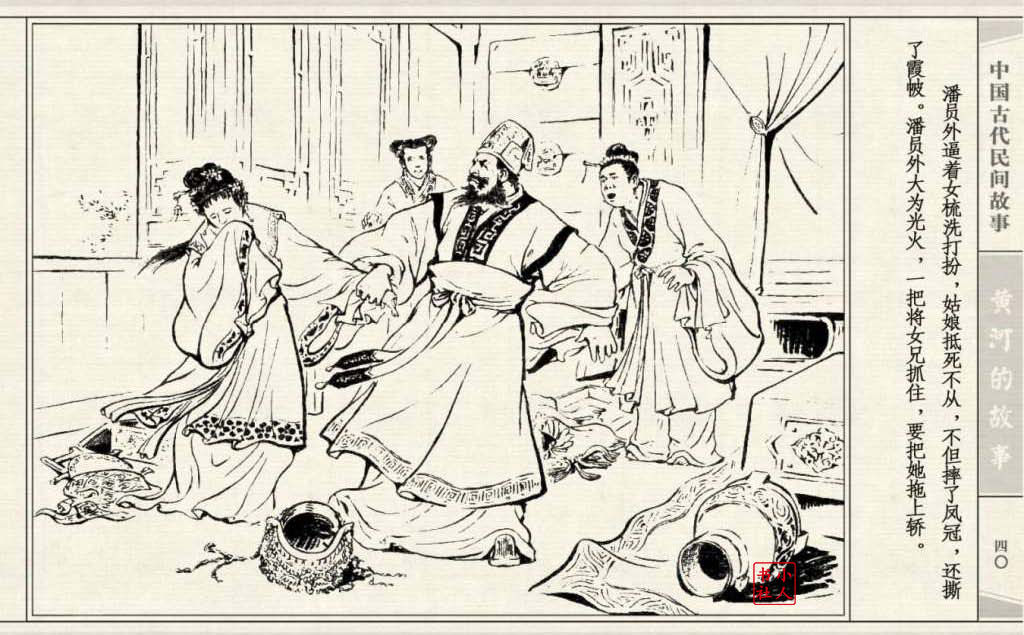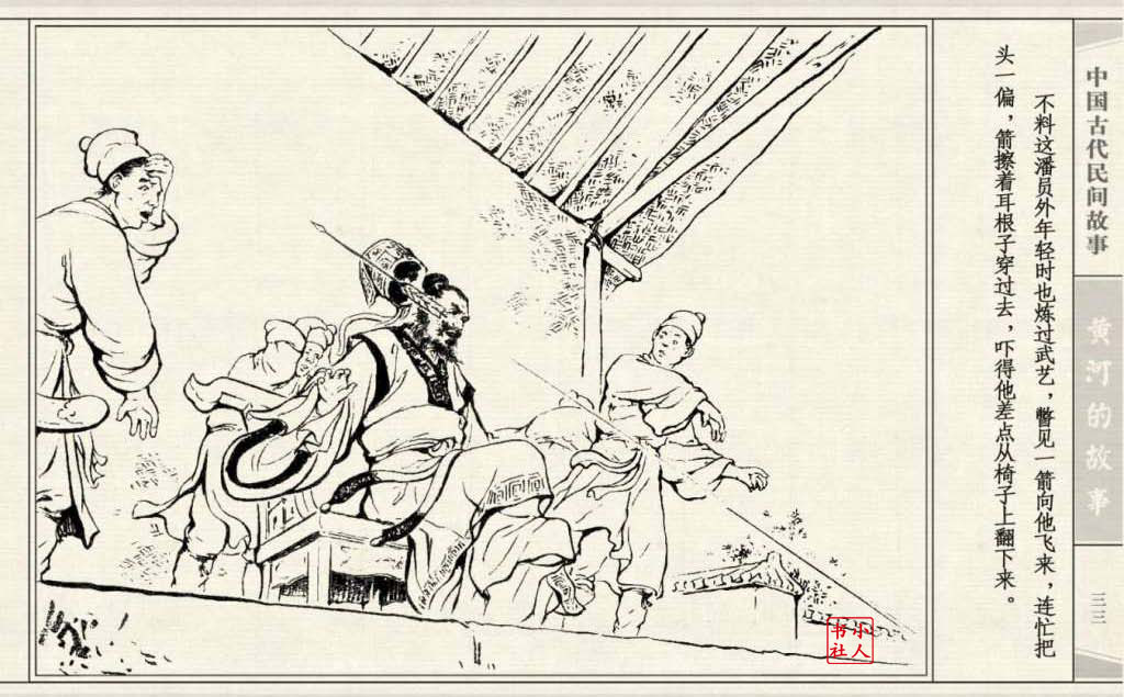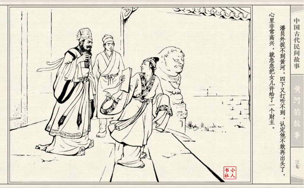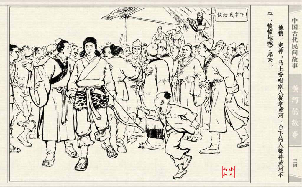 《黄河的故事》连环画是由良士改编,王亦秋绘画。故事讲述小伙子黄河与一位富家的姑娘相恋,黄河的生活由此而改变,爱得充满幻想和期待。姑娘的父亲潘员外为阻止他们相爱,以“比箭招亲”难为黄河。轻巧的一道题目,就让黄河败北,让黄河百步穿杨的箭术落空。黄河在失落之际远避深山苦炼武功,以图东山再起,挽回悲剧的命运,可以和姑娘终得圆满。然而,就在黄河艺成下山之时,姑娘早已因为不屈于压迫而香消玉陨。爱情终于在世俗的压迫下消失,愤怒也在世俗的压迫下膨胀,于是,黄河的眼泪汹涌而出,演变成“浊浪滔天”的“黄河”。
