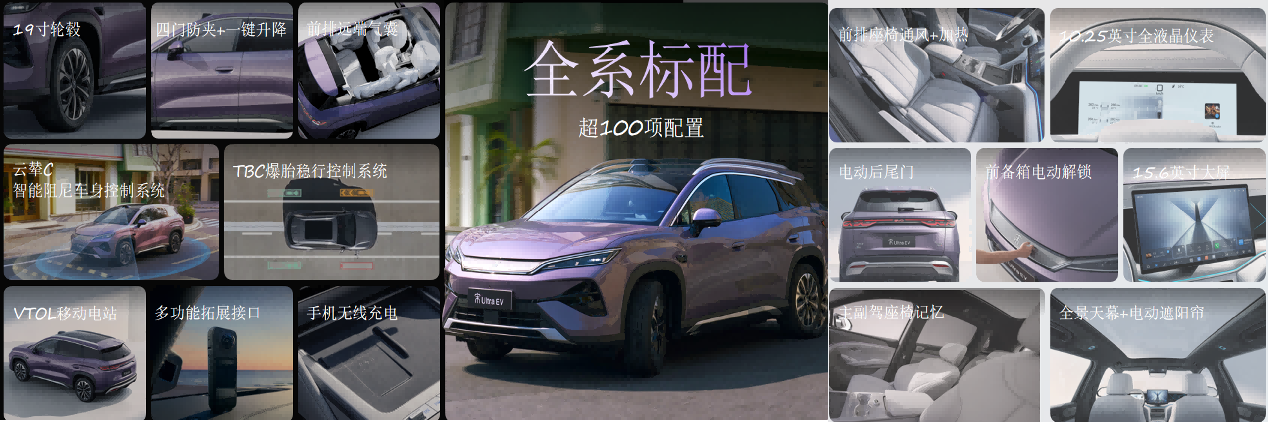 在配置方面,宋Ultra EV真正做到了“起步即满配”。全系标配第二代刀片电池、800V闪充技术、云辇-C智能阻尼车身控制系统、TBC高速爆胎稳行系统。其中,云辇-C系统可实现毫秒级无级自适应调节,搭配前双球头麦弗逊、后五连杆独立悬架,在高速过弯等场景下带来稳定精准的操控体验;TBC高速爆胎稳行系统则能在最高140km/h时速下爆胎瞬间介入,稳住车辆,为全家出行提供坚实安全保障。此外,全车配备7个安全气囊,包含同级少有的前排远端安全气囊,车身以高达77%的超高强度钢打造。