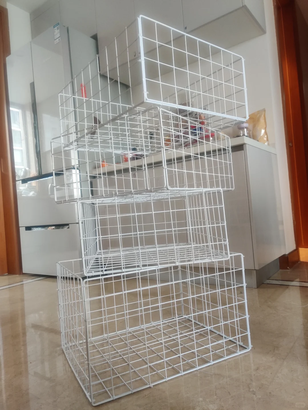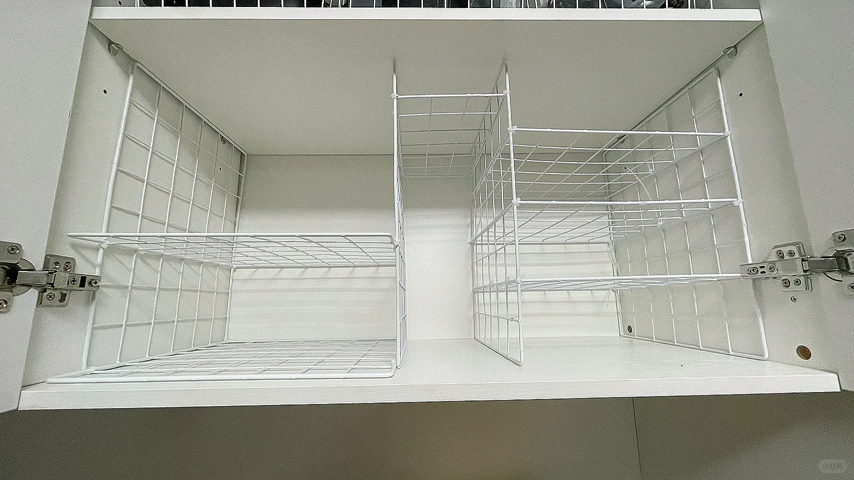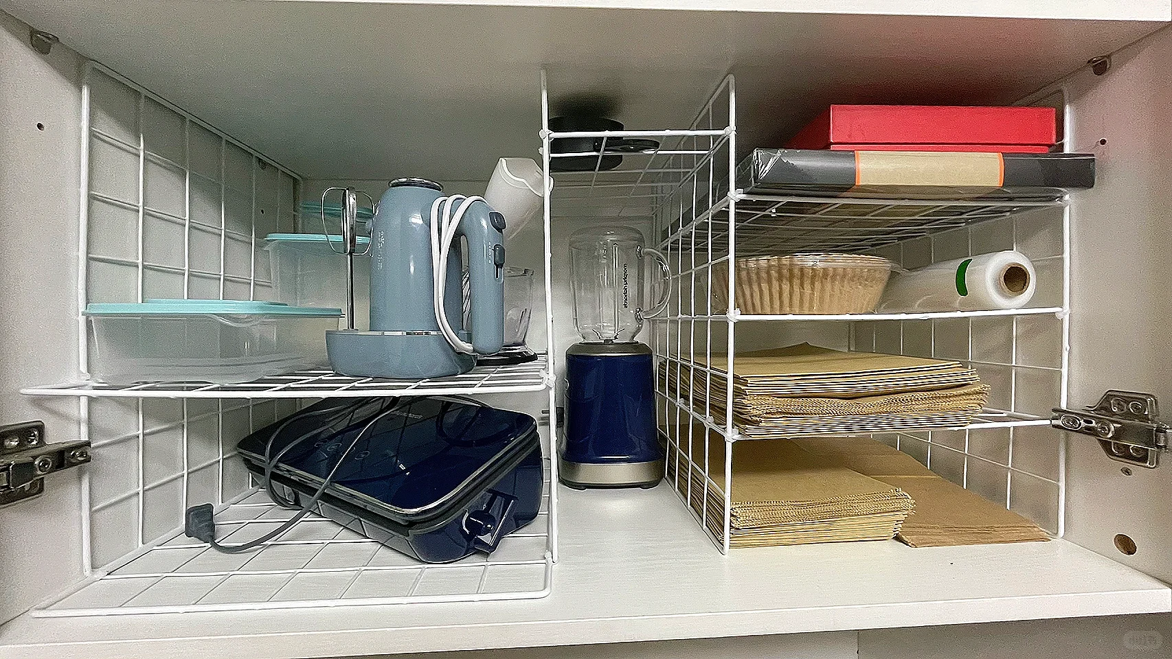 如果柜子的空间比较小,把物品全部都放在柜子隔层当中拿取非常不方便,可以使用网格片做好分层,增加柜子的储物空间,。