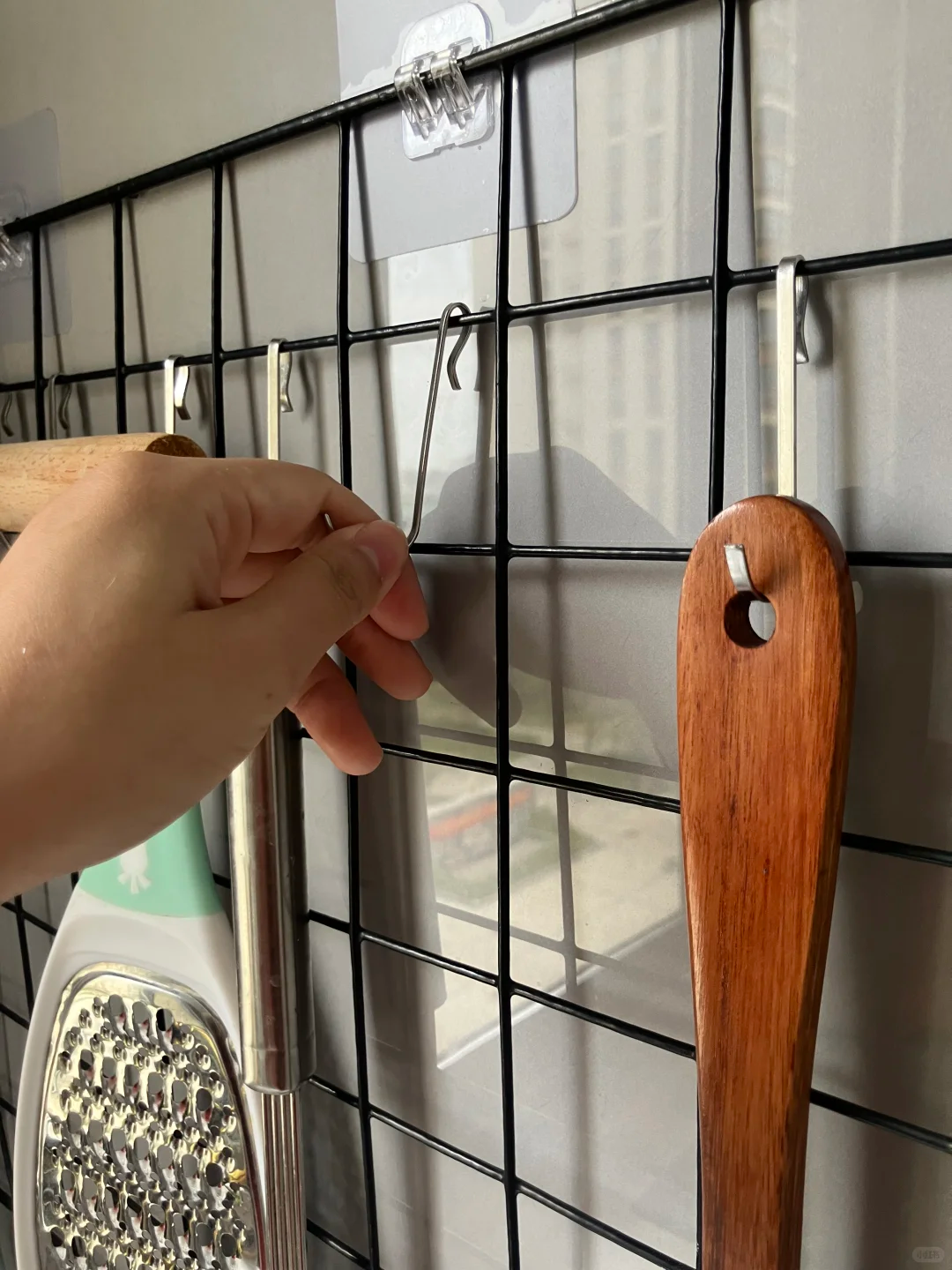 然后再使用小挂钩挂在网格片上,这样说那就不局限了,厨房里使用到的工具可以实现分层收纳,这个网格片搞定了,所有厨房工具。