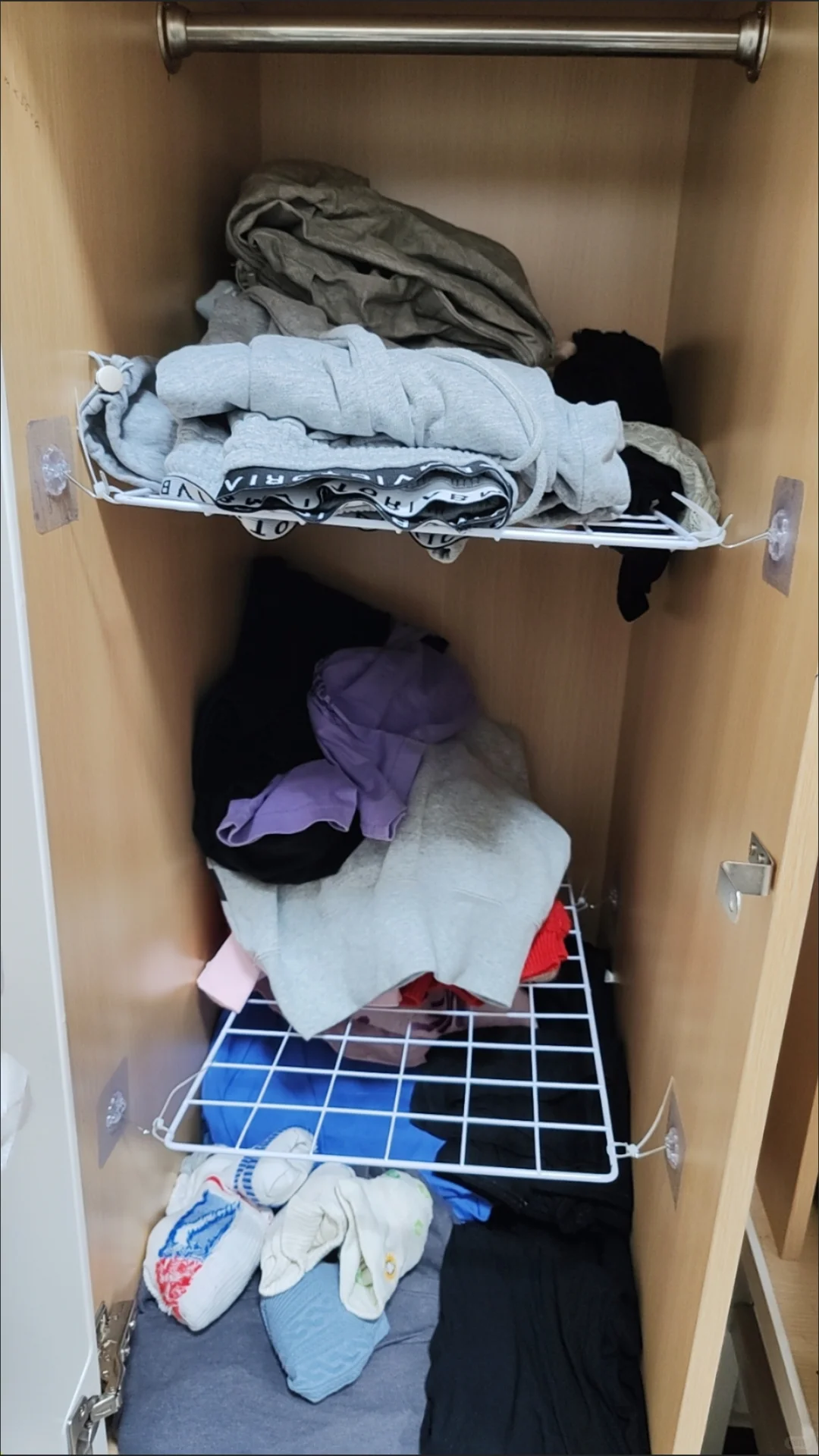 如果你的衣柜空间是这样的,比较高叠衣服和收纳不能堆太高不好拿,上面的空间又很浪费,可以将衣柜进行分层收纳,方法很简单,1个网格便就搞定。