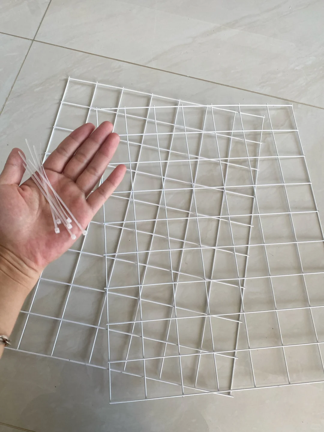 当然你也可以将网格骗 diy呈多种形状来收纳,一个小小的柜子竟然有无限的收纳可能,量好尺寸准备合适的网格片,然后使用扎带将网格片固定在一起。