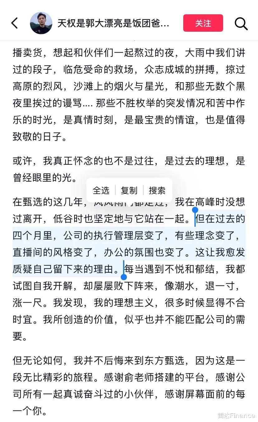天权也表示,“在甄选的这几年,风风雨雨都走过,我在高峰时没想过离开,低谷时也坚定地与它站在一起”。但在过去的四个月里,公司的执行管理层、理念、直播间风格、办公氛围都变了,这让他愈发质疑自己留下来的理由。