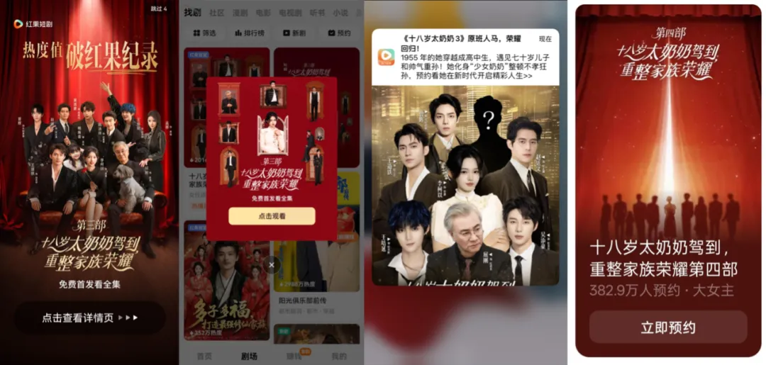 当系列新作上线时,红果会通过站内信、推送、专属海报等方式,主动触达预约用户和前作观众。这种“被惦记”的感觉,进一步提升了用户的好感度和观看意愿。以《太奶奶3》为例,首日播放中预约用户占比高达46.45%,充分印证了红果短剧预约机制和推广运营策略的成功。