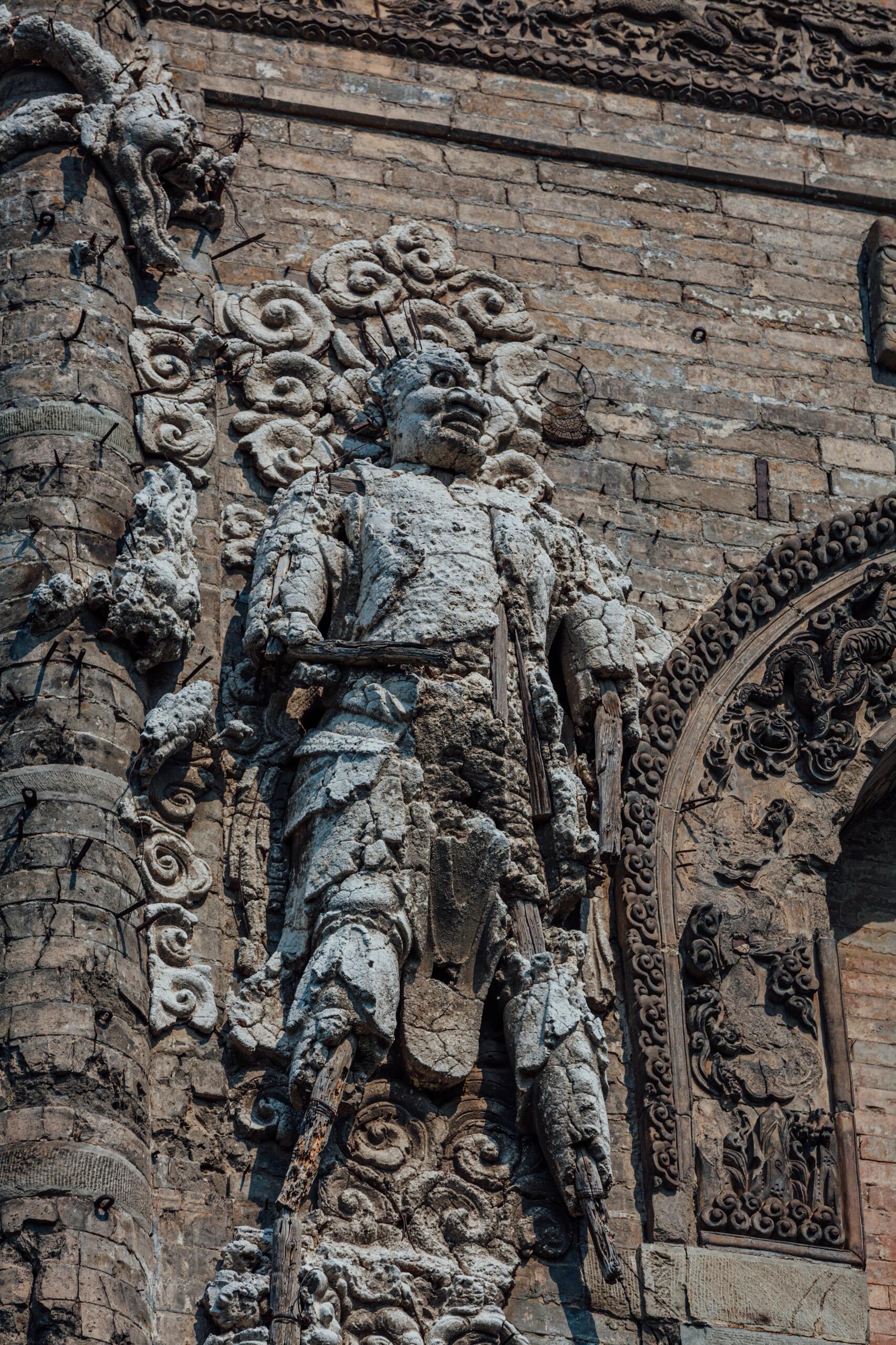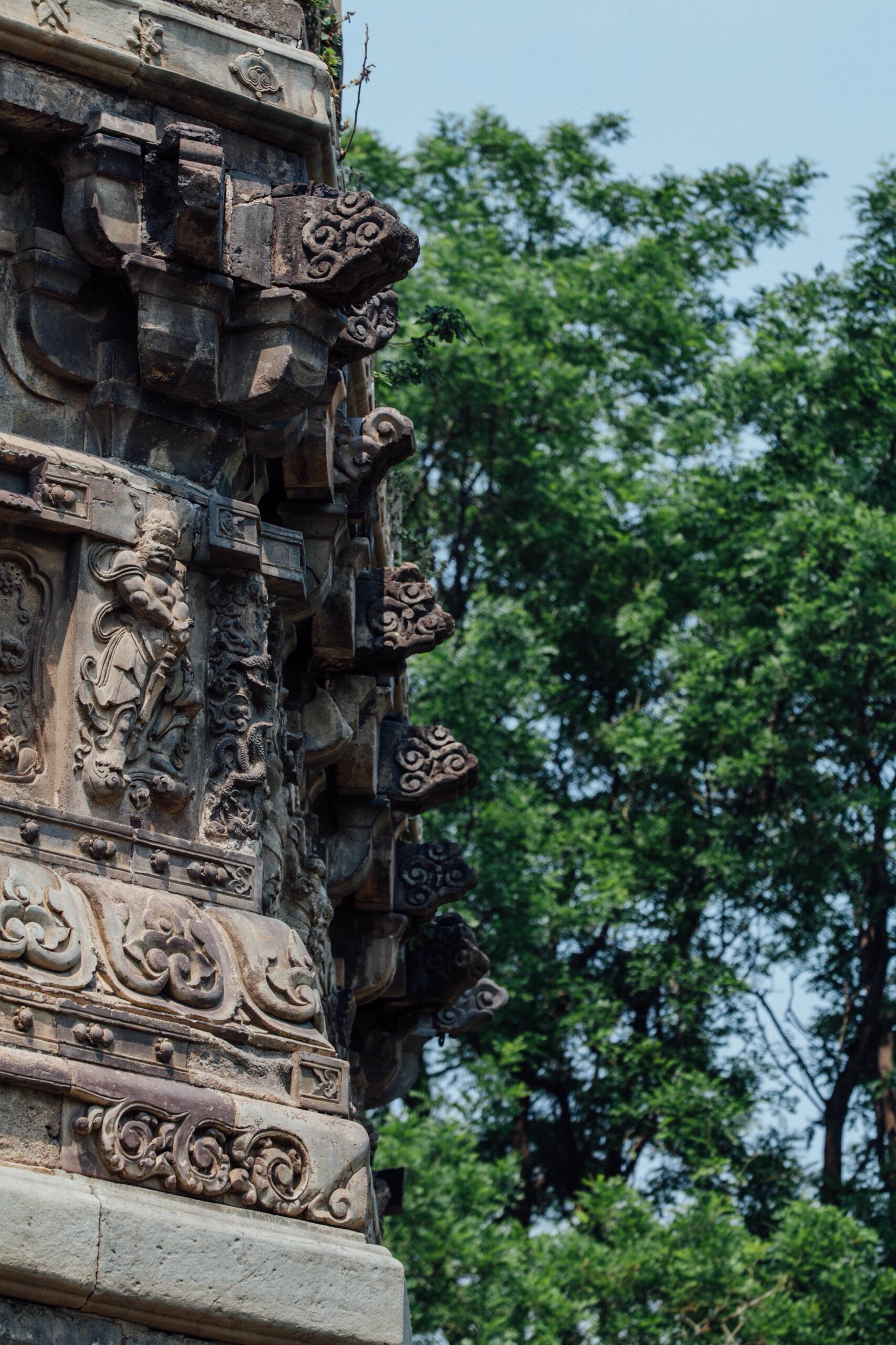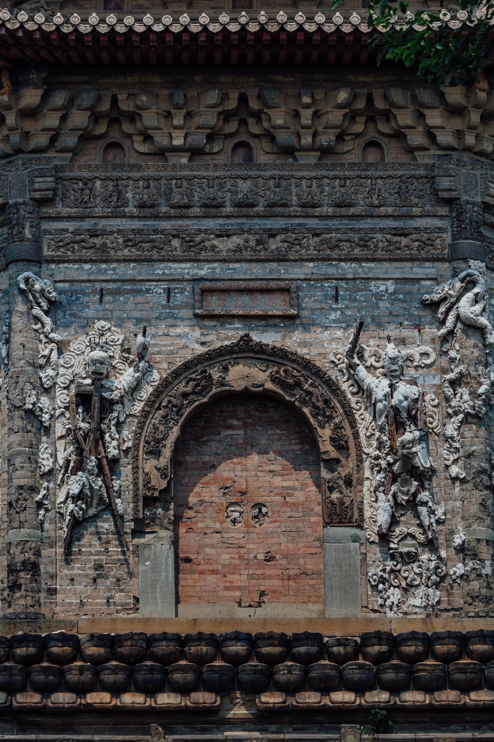 塔身第一层为塔身主体,每面宽4.2米,设假门与假窗。东侧假窗上方的泥塑观音像虽历经风化,仍可辨其头戴宝冠、手持净瓶的姿态。值得注意的是,观音像的面部特征呈现明显的女性化倾向,与明代民间“观音娘娘”信仰的普及直接相关。塔身转角处的砖雕圆柱,表面刻有竹节纹,这种仿木构做法在北方砖塔中较为少见,体现了江南匠师对北方营造工艺的影响。