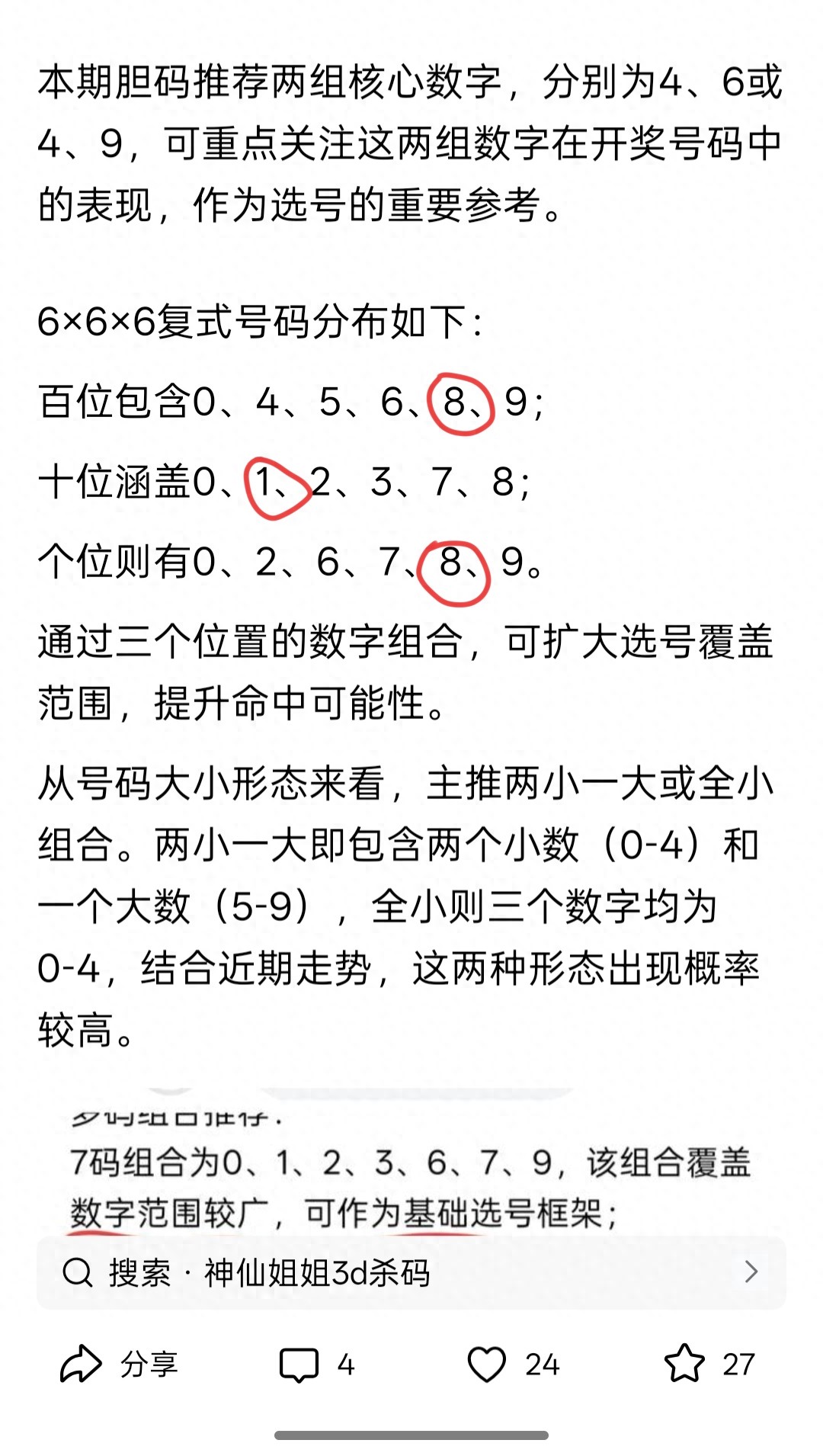 精选号码筛选如下:017、123、127、134、236、349、367、378、459、478、556、567、578、677、778。这些号码综合了胆码、奇偶形态及多码特征,可重点关注。