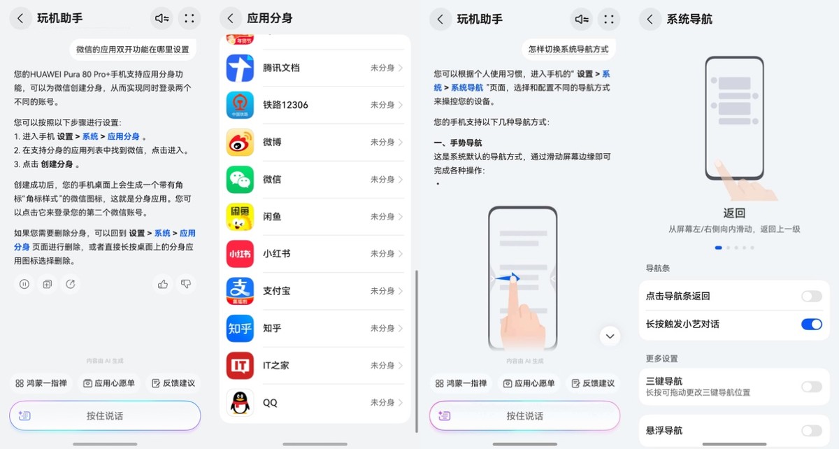 比如我之前问了两个常见问题:“微信的应用双开功能在哪里设置?”“怎样切换系统导航方式?”每次问完,小艺不仅会给到清晰的文字步骤指引,更贴心的是,回答里通常会带有蓝色的关键词,点一下就能跳转到对应的设置页面,直接就能操作设置。