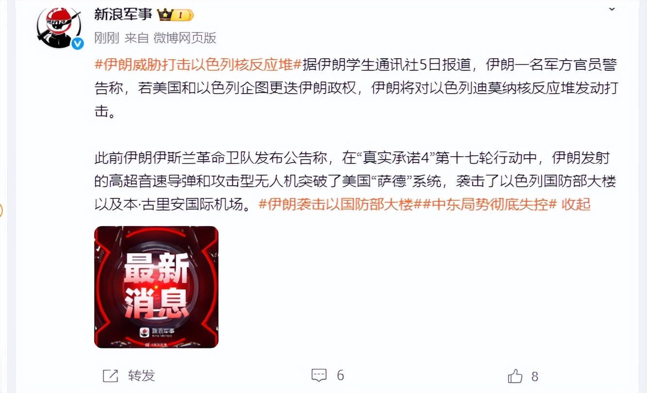 据悉,伊朗表示未来几天,攻击强度与范围还将进一步扩大,更加让人解气的是,其中伊朗一名军方官员警告美以说,若美国和以色列企图更迭伊朗政权,伊朗将对以色列迪莫纳核反应堆发动打击。要知道伊朗这次可不是说着玩的,从这次第17轮的打击中我们也能看出伊朗是有能力打败以色列的,已经有两次对以色列重要地区精准打击了,下次的话伊朗更是有经验有信心了。