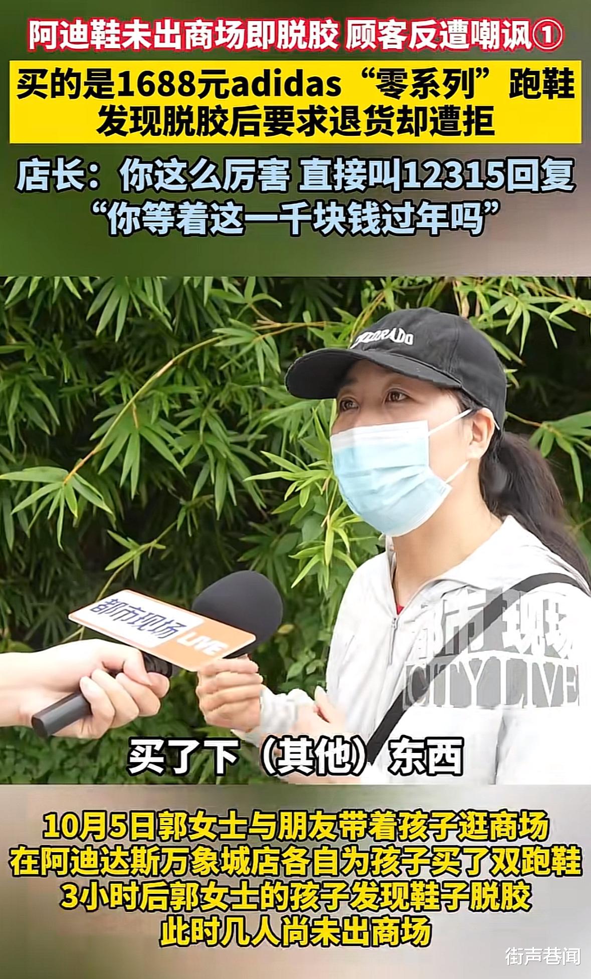 江西南昌,一女子买了一双阿迪达斯跑鞋,刚还未离开商场,发现鞋面开胶了,遂找销售员退货,店长却说:“你等这1000块钱过年吗?”