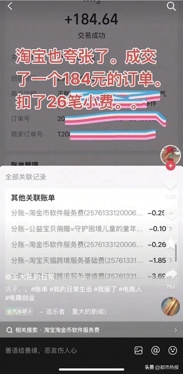 “不知道,也没有报过,(这个服务)关也关不掉”,一位做跨境业务的广东商家向北京青年报抱怨称:自己在淘宝的一笔184元的订单,被扣了26笔平台服务费,其中还有不知从何而来的“软件服务费”。