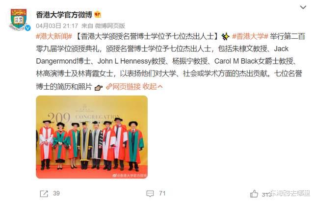 细心的网友也不难发现,博士们的合影中并未看到杨振宁教授的身影。 据悉杨振宁由于身体原因,不方便亲自到香港,因此缺席了此次颁授典礼。想想他今年已经101岁高龄了,确实经不起从北京到香港的舟车劳顿,香港大学方表示完全可以理解。