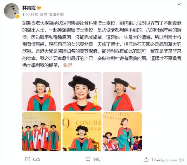 而其中大家最熟悉的就是杨振宁和林青霞了,先来说说林青霞,1954年出生的她今年也已经69岁了,演艺生涯中共参演过上百部作品,还出版过四部散文集,风光无限获奖无数,这次喜获香港大学名誉博士学位,更是令她无比开心,并专门发文向香港大学致谢。