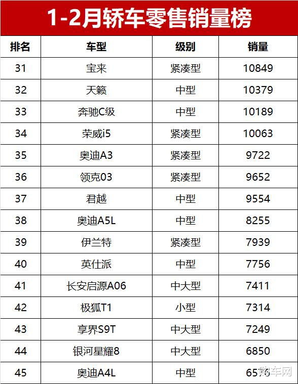 【2026年1-2月轿车零售销量排行榜】开年车市遇冷!相信不少关注车市的朋友都能感觉到,2026年刚过去俩月,轿车市场的热度明显不如往年。乘联会最新数据显示,1-2月份国内轿车市场累计零售销量只有104.4万辆,同比暴跌29.6%,跌幅相当明显。更让人意外的是,以往风光无限的新能源轿车集体“哑火”,反而传统燃油车扛起了大旗;月均销量破万辆的车型仅16款,市场整体疲软。反转!1-2月轿车销量榜完整版,燃油车霸榜前十八,新能源领头羊比亚迪竟未进前二十!