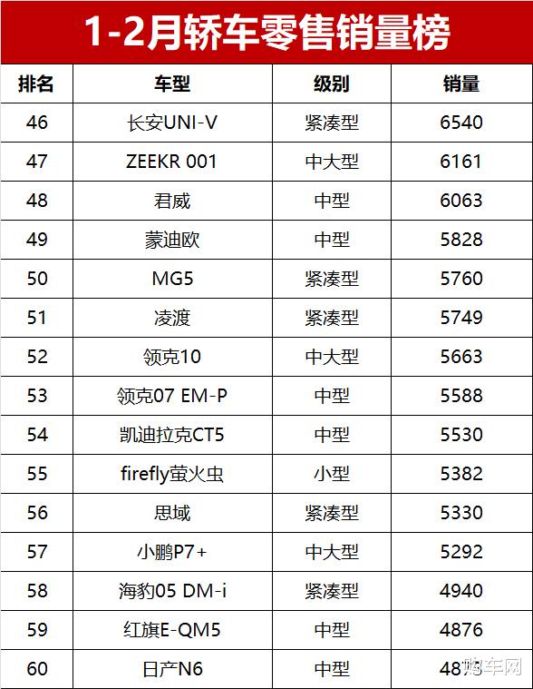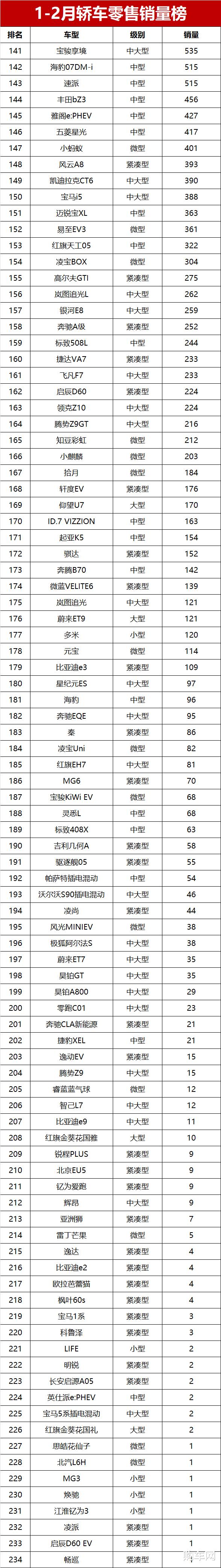 具体来看,1-2月份累计销量超过2万辆(也就是月均破万辆)的轿车只有16款,比起去年同期大幅减少,这也能看出开年车市的冷清。不过冷清之中也有亮点,吉利星愿以56369辆的成绩断层夺冠,成为唯一跻身前十八的新能源车型,要知道这款车上市以来累计销量已经超过61万辆,连续多月保持高销量,实力确实能打。