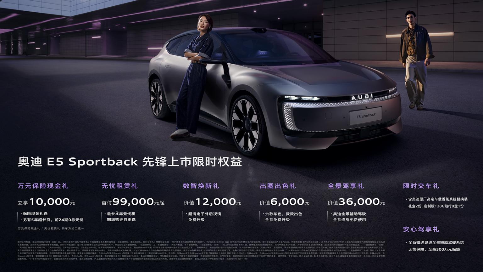 奥迪E5 Sportback定位一款中型纯电旅行车,首次采用“AUDI”车标,最长纯电续航达773km,最快百公里加速3.4s。即日起至2025年12月31日,新车享有全系1万元保险现金礼遇、5年超长贷及前24期0息、首付9.9万元起、最长3年无忧租及期满购还自由选、价值1.2万元的电子外后视镜免费升级、价值6000元的六款车色免费升级、价值3.6万元的奥迪全景辅助驾驶终身免费使用、奥迪原厂车载香氛系统替换装礼盒2份、定制版128G随行U盘1份、至高500万元智能驾驶辅助系统保额等购车礼。