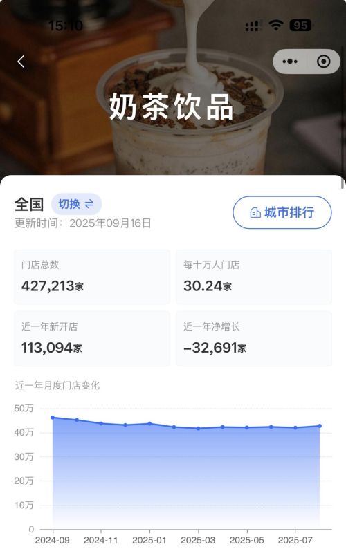 据窄门餐眼数据显示,截止 2025 年 9月16日,过去一年新开茶饮门店约 11.3万家,但同期倒闭近15万家,净减少3.2万家。