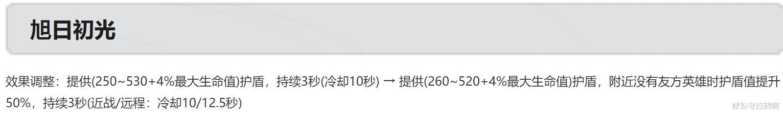 旭日初光(加强):效果调整:提供(250~530+4%最大生命值)护盾,持续3秒(冷却10秒) → 提供(260~520+4%最大生命值)护盾,附近没有友方英雄时护盾值提升50%,持续3秒(近战/远程:冷却10/12.5秒)
