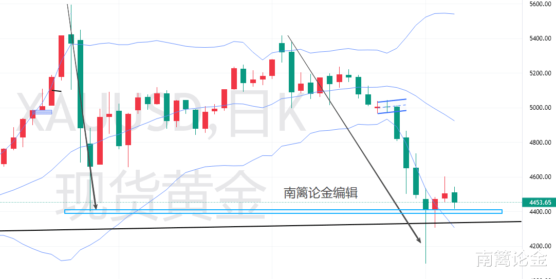 技术面,日线连续三天反弹,报收两连阳,短期的止跌信号确实明确。但昨天的收线是有一根长上影线的小阳,会有一些些弱势下压,也是筑底信号还没出现的关键。当前的关键支撑呢,已经逐渐下移至4400整数关口,这是前两天的整固平台。同时该区间也是今年金银阶段冲高的起点,形成比较强势的支撑。