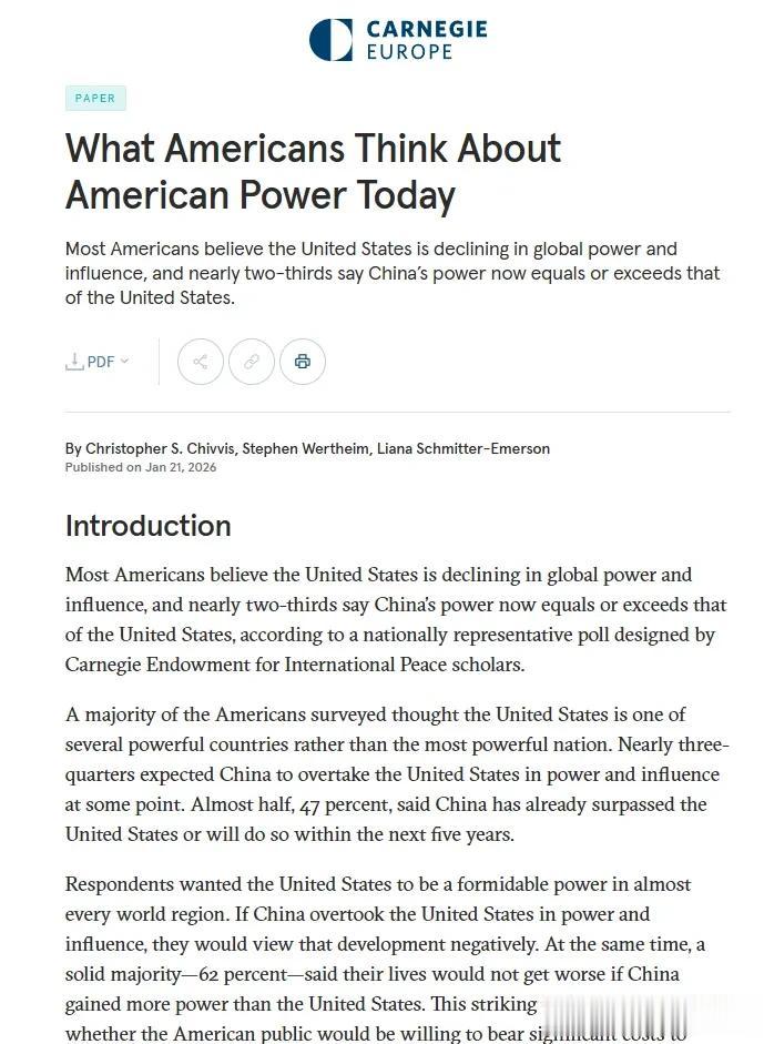 2026年1月,美国的权威智库卡内基经过广泛调研,发布了重磅报告,标题为:大约2/3的美国人认为中国与美国实力相当或已经超越了美国!