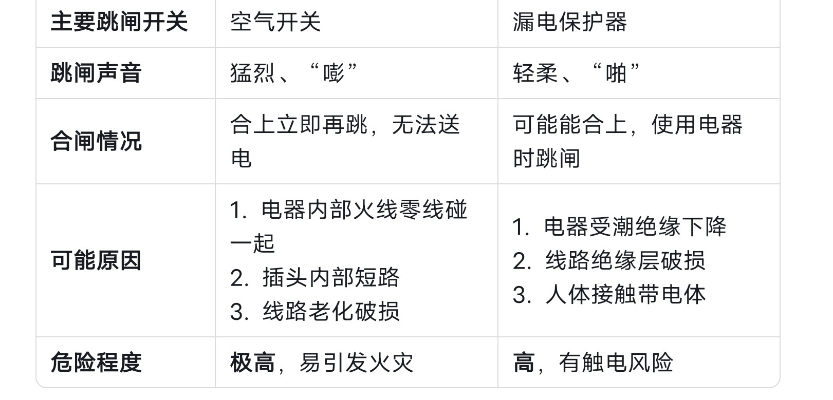 - 空气开关跳闸 → 大概率短路(空开管过载、短路,大电流瞬间触发)
