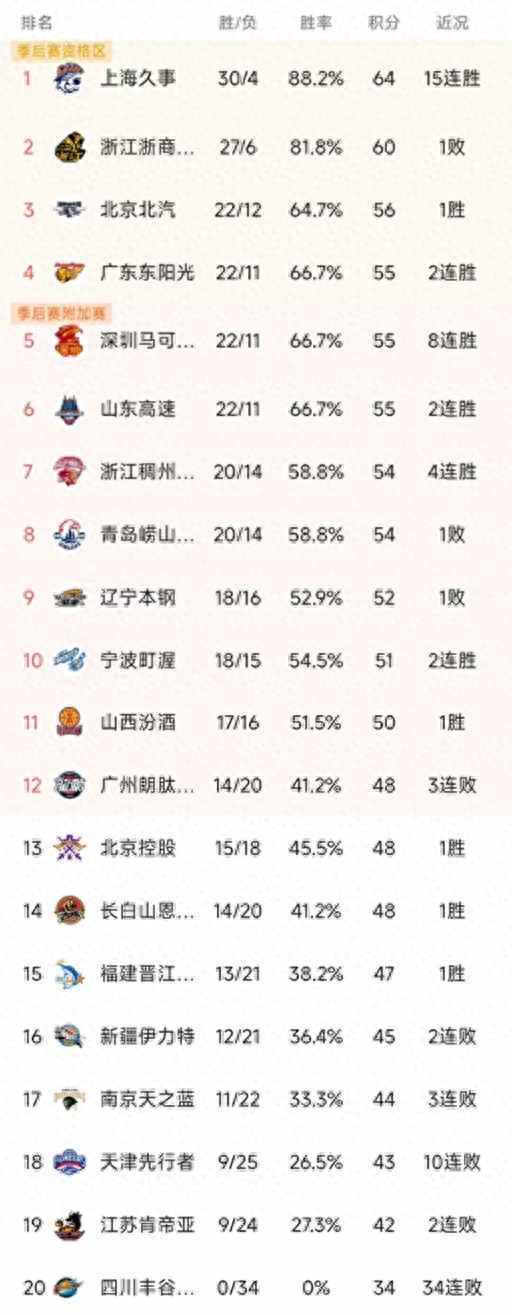 CBA最新积分榜