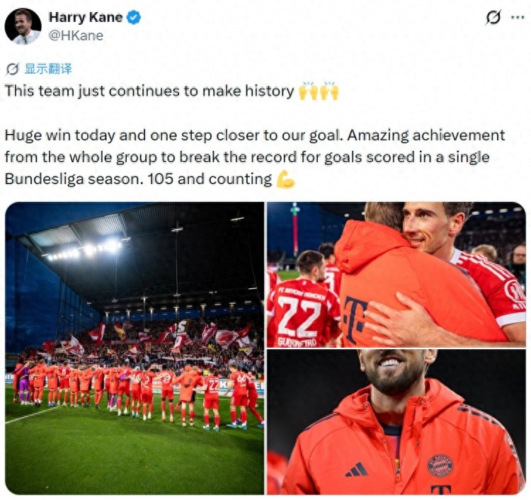 他也在赛后通过社媒晒出比赛照,并庆祝胜利:“这支球队仍在创造历史🙌🙌今天取得重大胜利,离我们的目标又近了一步。全队共同努力取得非凡成就,打破了德甲单赛季进球纪录。目前已经105球了,而且还在继续增加!”