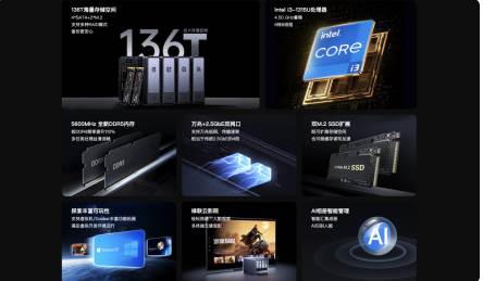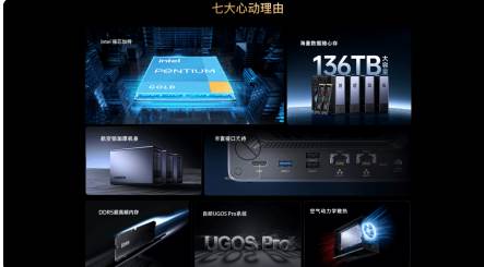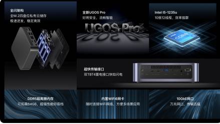 首先给到了12代intel i5-1235u,还有双雷电4、万兆网口、128GB SSD闪存、双通道DDR5内存(预装8GB)、四盘位、全金属机身一系列豪华配置。