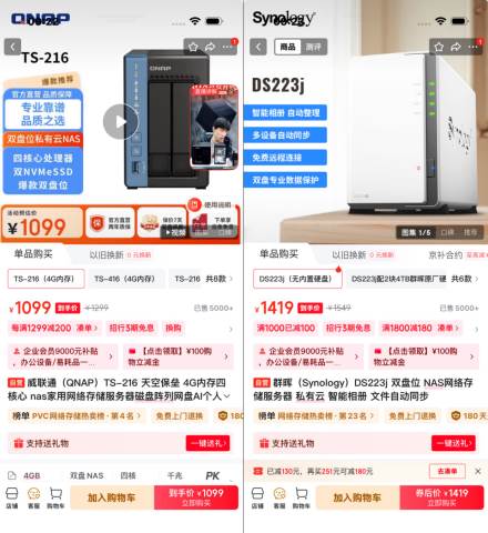 如果你的需求是千元+专业用途,也可以买到一些老牌厂商的NAS产品,例如威联通TS-216和群晖DS223j,这应该是你能用最少成本就能体验到威联通和群晖老牌专业NAS系统的产品了。