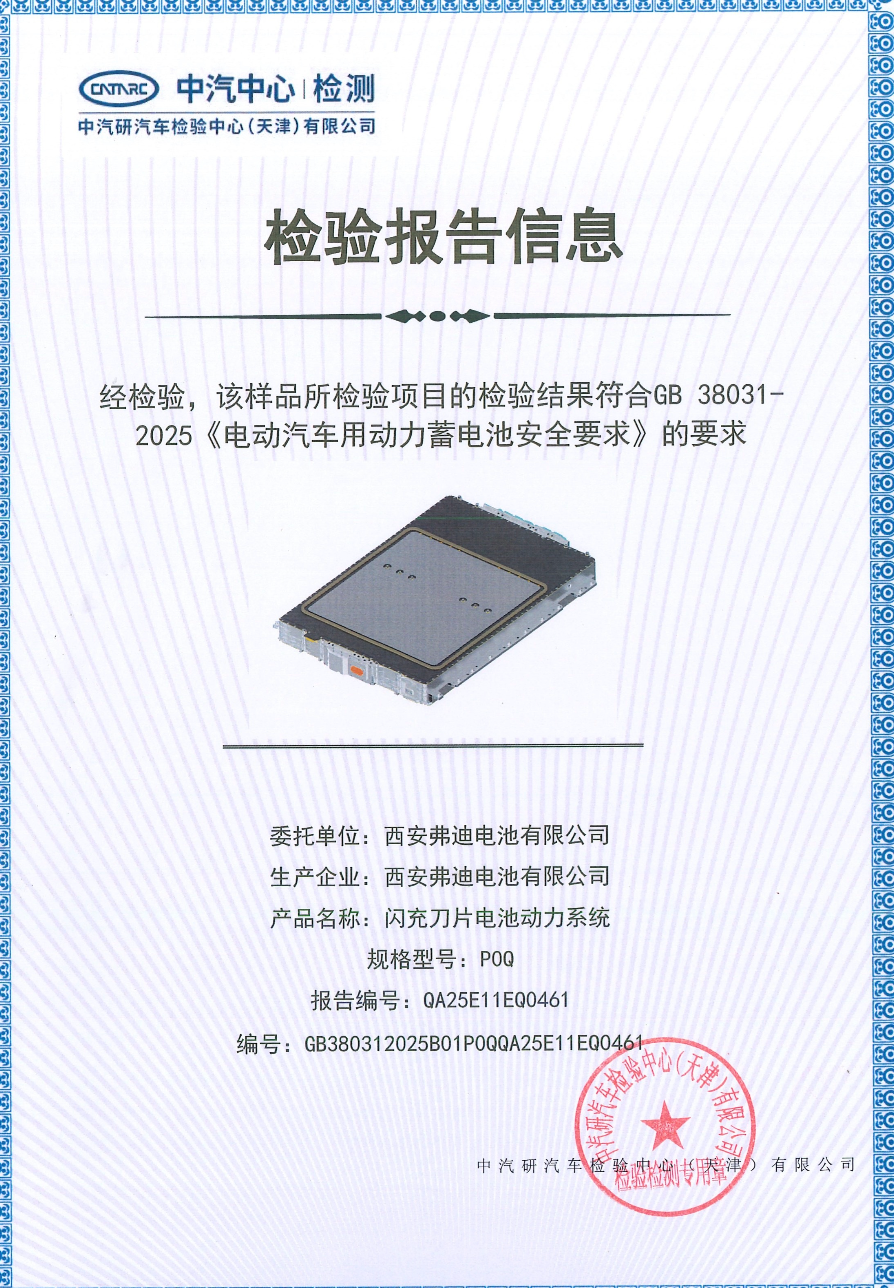 并且在今年5月份,比亚迪刀片电池和闪充刀片电池双双提前通过最新国标GB 38031-2025《电动汽车用动力蓄电池安全要求》全项检测,并获得中汽研汽车检测中心专业认证证书,提前满足新国标要求。