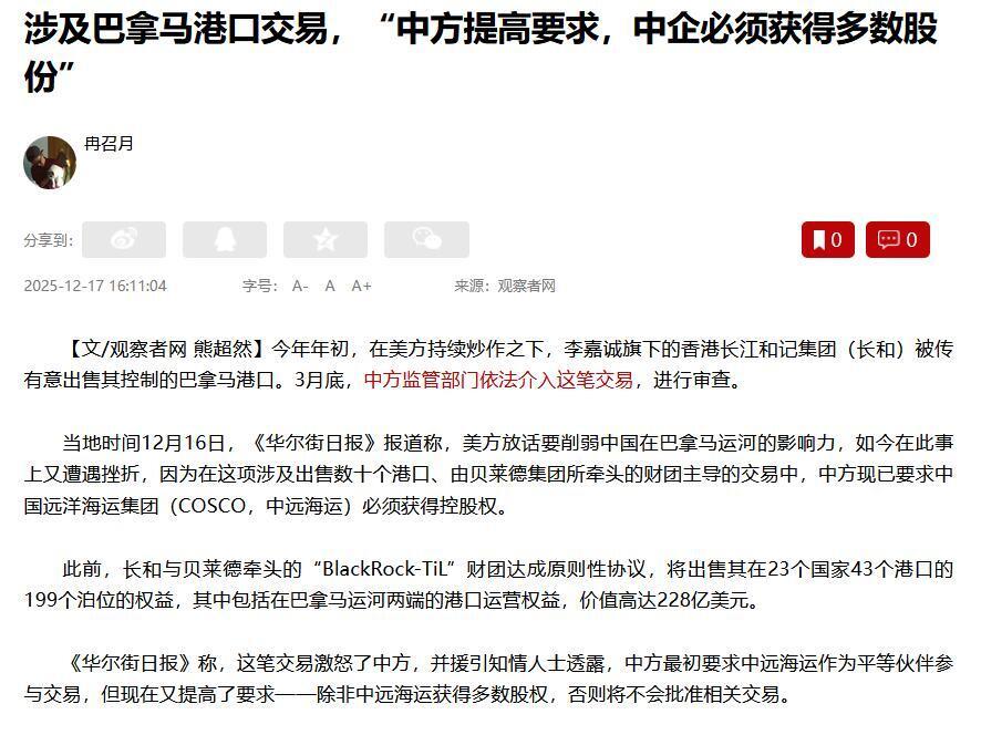 结果没想到,时隔大半年的港口交易大案却最终迎来了大反转。因为这边根据媒体报道,中国对于此次交易提了一项新的要求。那就是交易可以继续,但是中国企业必须获得多数股权。