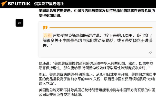 万斯:未来几周将明确中国是否要与美国打贸易战——俄罗斯卫星通讯社2025-10-13 01:19