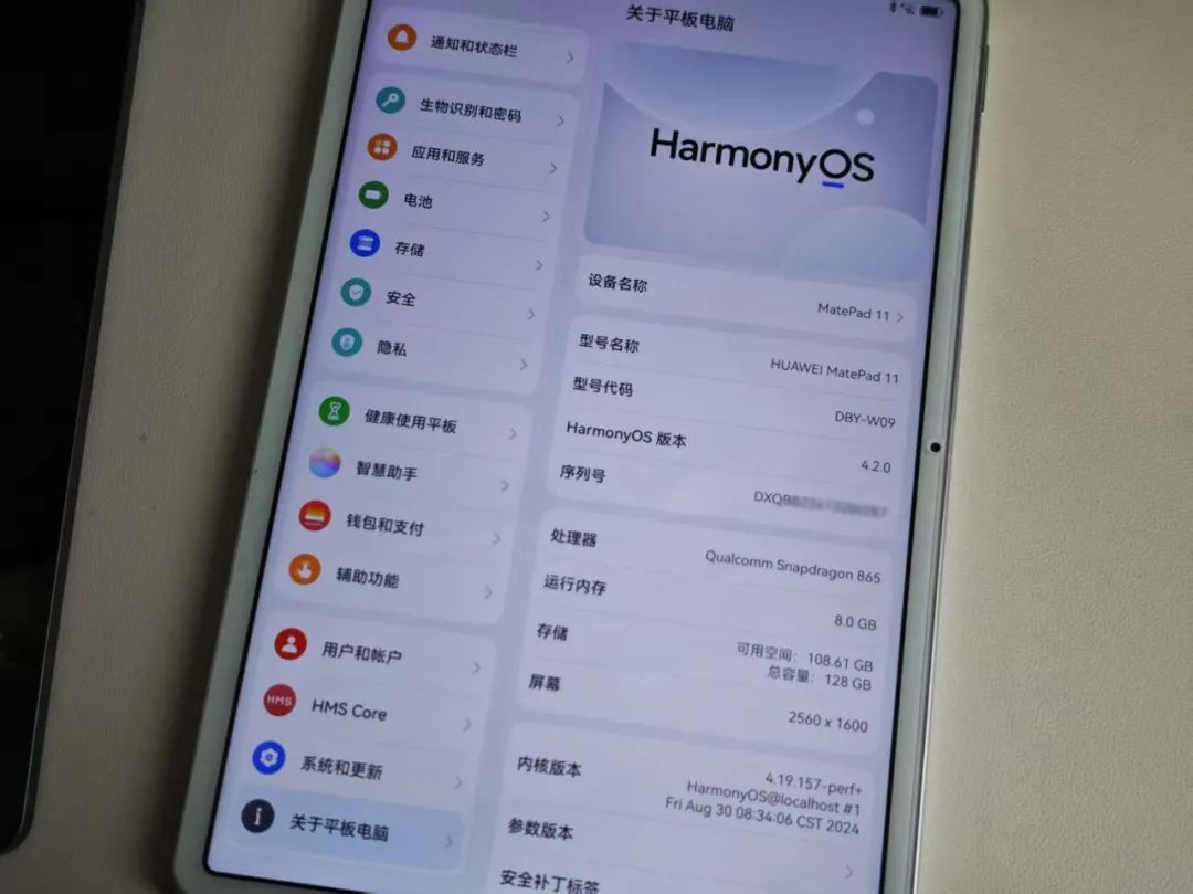 再看下配置都对,目前华为MatePad11可以升到鸿蒙4.2系统,流畅度那是相当不错,8G+128G也是黄金搭档组合,不像6G+64G或6G+128G版本那样局促