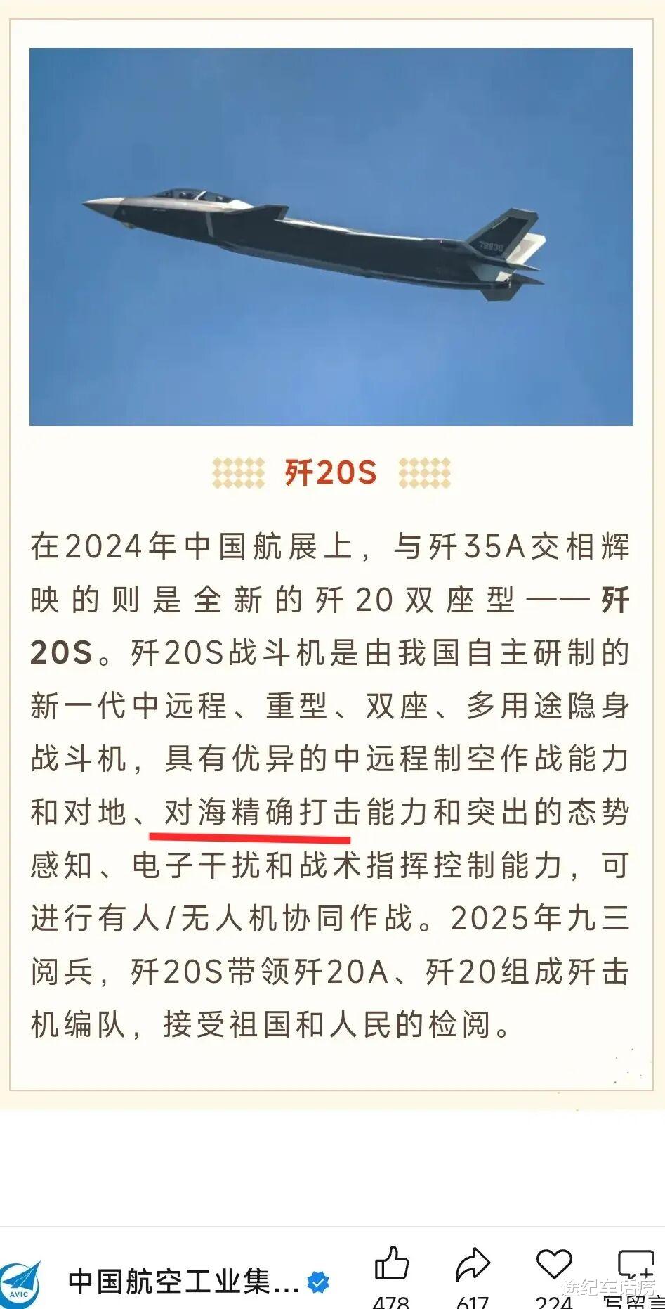 一、对海精确打击:隐身战机也能精准反舰“对海精确”这四个字,在军事上分量极重。这意味着歼-20S不光能空战,还能精准打击海上目标,成了一款全能型的隐身战机。