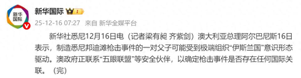 澳大利亚总理阿尔巴尼斯16日表示,制造悉尼邦迪滩枪击事件的一对父子可能受到极端组织“伊斯兰国”意识形态驱动。澳政府正联系“五眼联盟”等安全伙伴,以确定枪击事件是否存在任何国际关联。