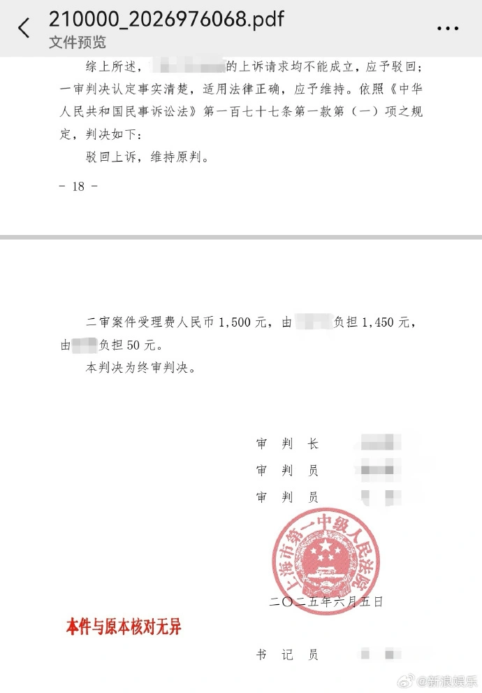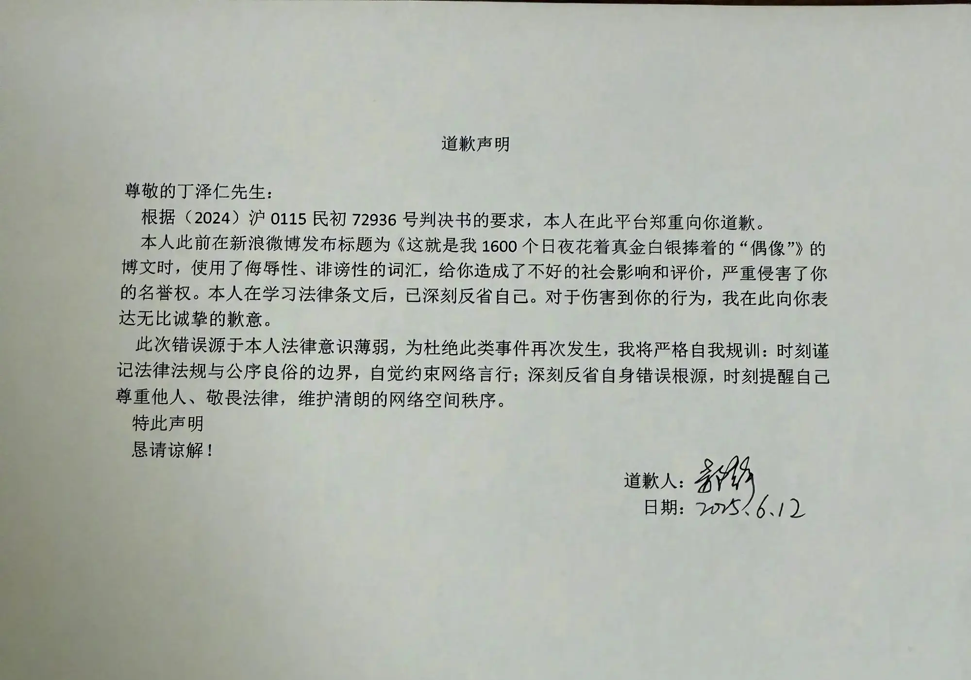 尽管爆料内容基本属实,但郝女士在文中使用的 “舔狗似的”“你全裸出去都会喜滋滋”“快去做鸭吧” 等词汇,被法院认定超出合理批评限度,带有明显人格贬损性质,构成对丁泽仁名誉权的侵害。最终判决结果为:郝女士在微博置顶道歉声明10天(落款日期实为2025年6月12日);赔偿丁泽仁精神损害抚慰金2万元、维权费用3.1452万元,合计约5.1万元。